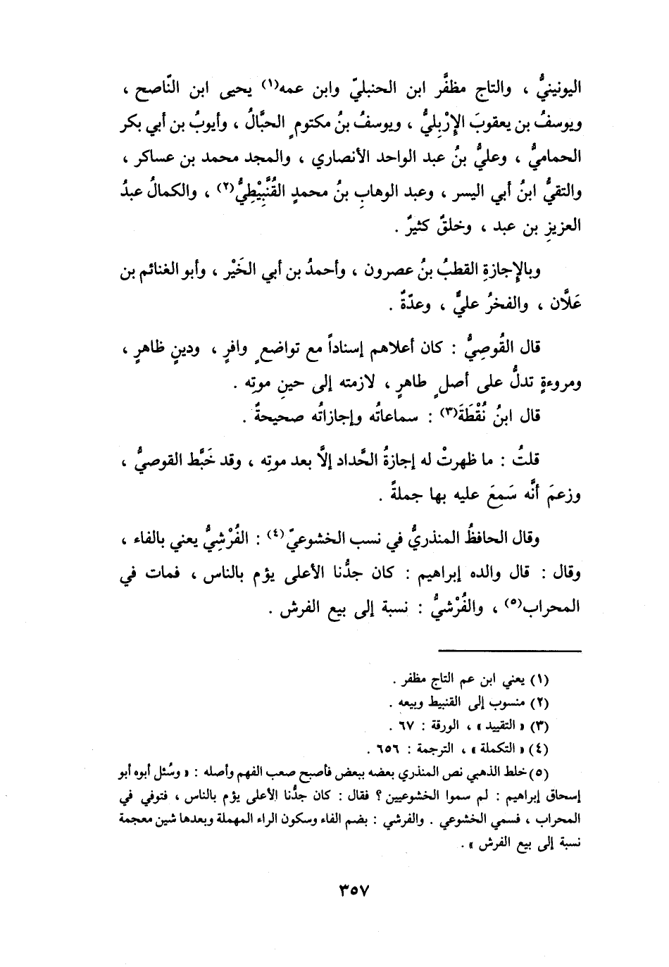 وَقَالَ الحَافِظُ المُنْذِرِيُّ فِي نَسَبِ الخُشُوْعِيِّ (4) : الفُرْشِيُّ يَعْنِي بِالفَاءِ، وَقَالَ: قَالَ وَالِدُهُ إِبْرَاهِيْمُ: