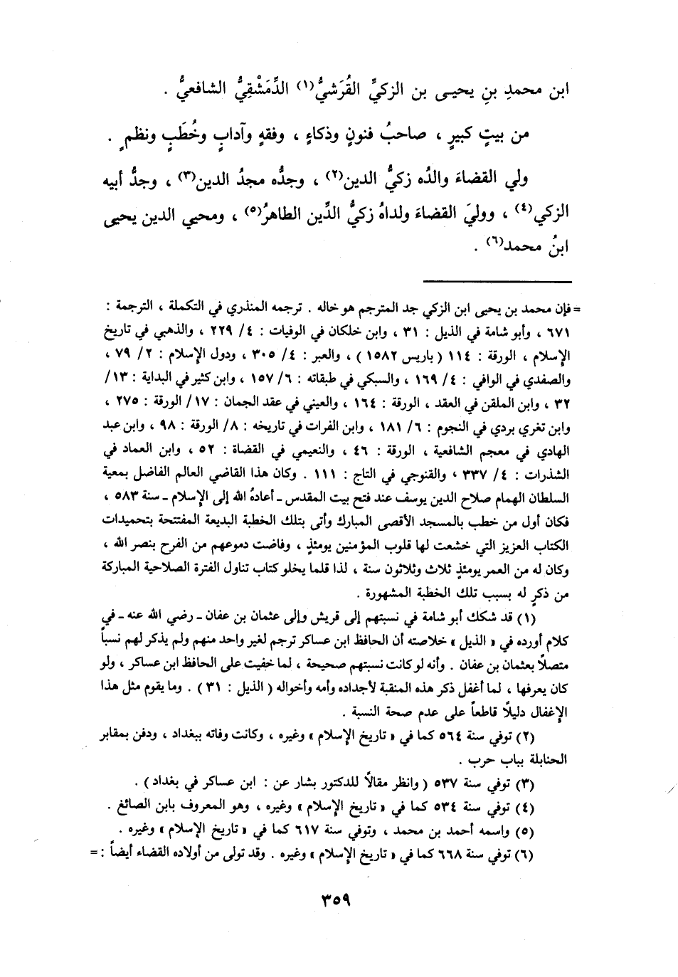 بنِ مُحَمَّدِ بنِ يَحْيَى بنِ الزَّكِيِّ القُرَشِيُّ (1) ، الدِّمَشْقِيُّ، الشَّافِعِيُّ.