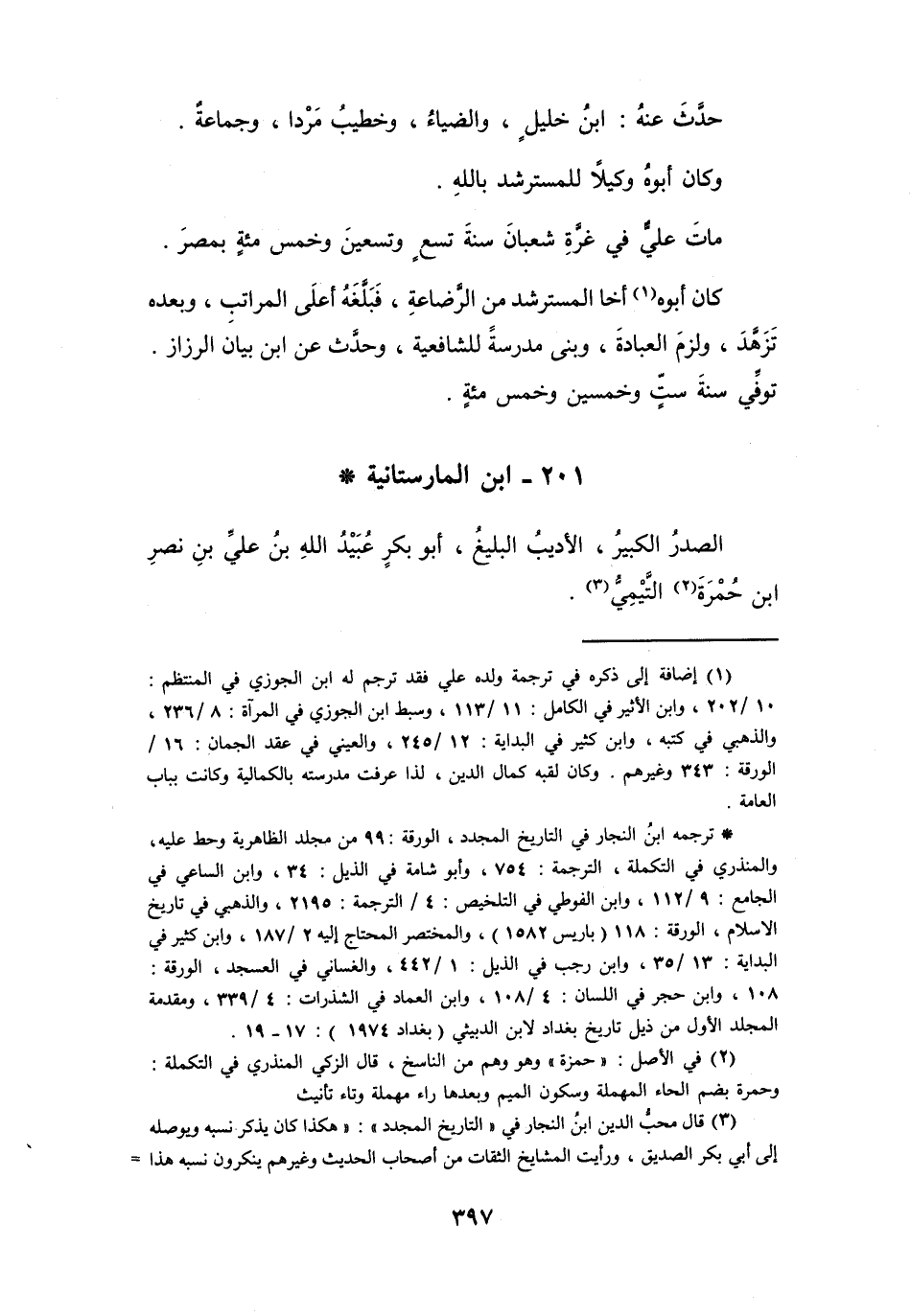 (1) إضافة إلى ذكره في ترجمة ولده علي فقد ترجم له ابن الجوزي في المنتظم: 10 / 202، وابن الأثير في الكامل: 11 / 113، وسبط ابن الجوزي في المرآة: 8 / 236، والذهبي في كتبه، وابن كثير في البداية: 12 / 245، والعيني في عقد الجمان: 16 / الورقة: 343 وغيرهم.