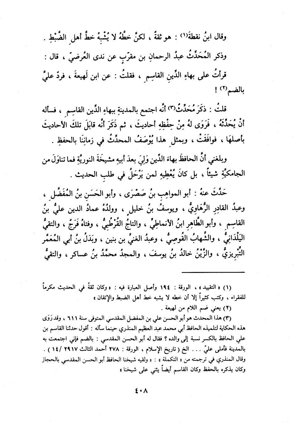 قُلْتُ: ذكر مُحَدِّث (3) أَنَّهُ اجْتَمَع بِالمَدِيْنَةِ بِبَهَاء الدِّيْنِ القَاسِم، فَسَأَلَهُ أَنْ يُحَدِّثهُ، فَرَوَى لَهُ مِنْ حِفْظِهِ أَحَادِيْث، ثُمَّ ذَكَرَ أَنَّهُ قَابل تِلْكَ الأَحَادِيْث بِأَصلهَا، فَوَافَقت، وَبمثل هَذَا يُوْصَف المُحَدِّث فِي زَمَانِنَا بِالحِفْظ.