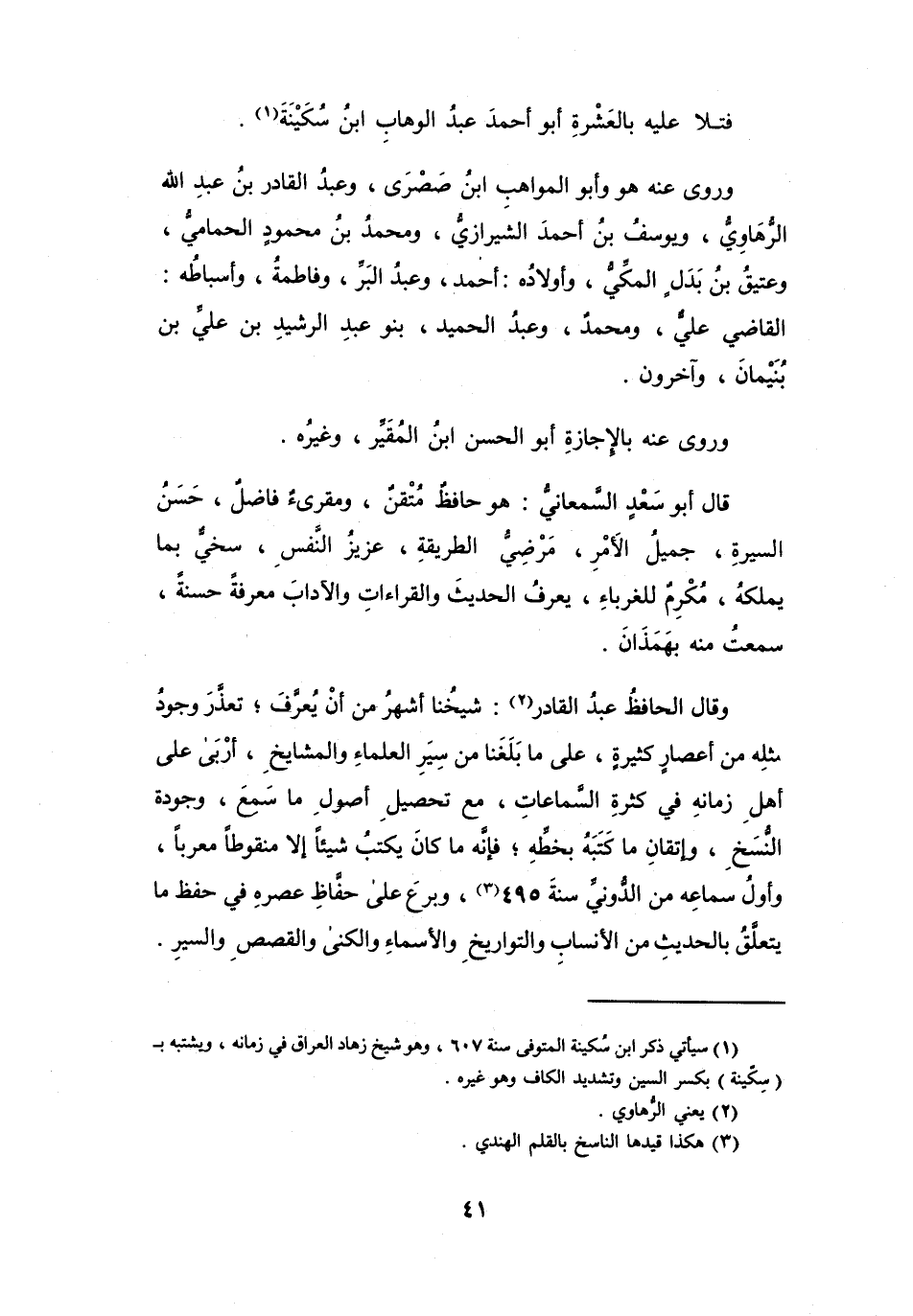 (1) سيأتي ذكر ابن سكينة المتوفى سنة 607، وهو شيخ زهاد العراق في زمانه، ويشتبه ب (سكينة) بكسر السين وتشديد الكاف وهو غيره.