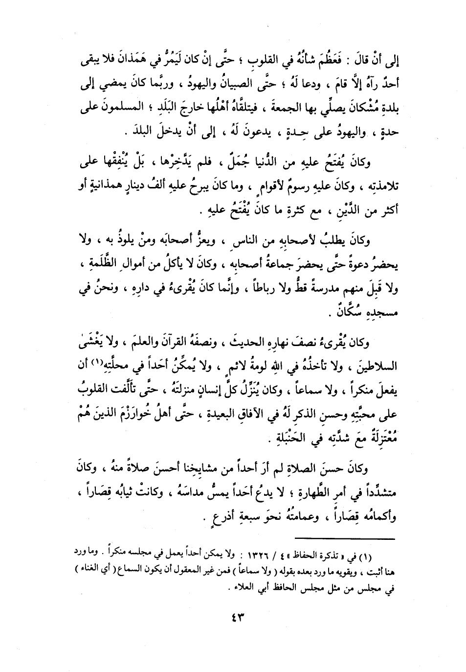 وَكَانَ يُقْرِئُ نِصْف نَهَاره الحَدِيْث، وَنِصْفه القُرْآن وَالعِلْم، وَلاَ يَغشَى السَّلاَطِيْن، وَلاَ تَأْخُذُهُ فِي اللهِ لُوْمَة لاَئِم، وَلاَ يُمكِّن أَحَداً فِي محلَّته (1) أَنْ يَفعل مُنْكراً، وَلاَ سَمَاعاً، وَكَانَ يُنَزِّلُ كُلّ إِنْسَان مَنْزِلته، حَتَّى تَأَلَّفت القُلُوْب عَلَى مَحَبَّته وَحسنِ الذّكر لَهُ فِي الآفَاق البعيدَة، حَتَّى أَهْل خُوَارِزْم الَّذِيْنَ هُم مُعْتَزِلَة مَعَ شدته فِي الحَنْبَلَةِ.
