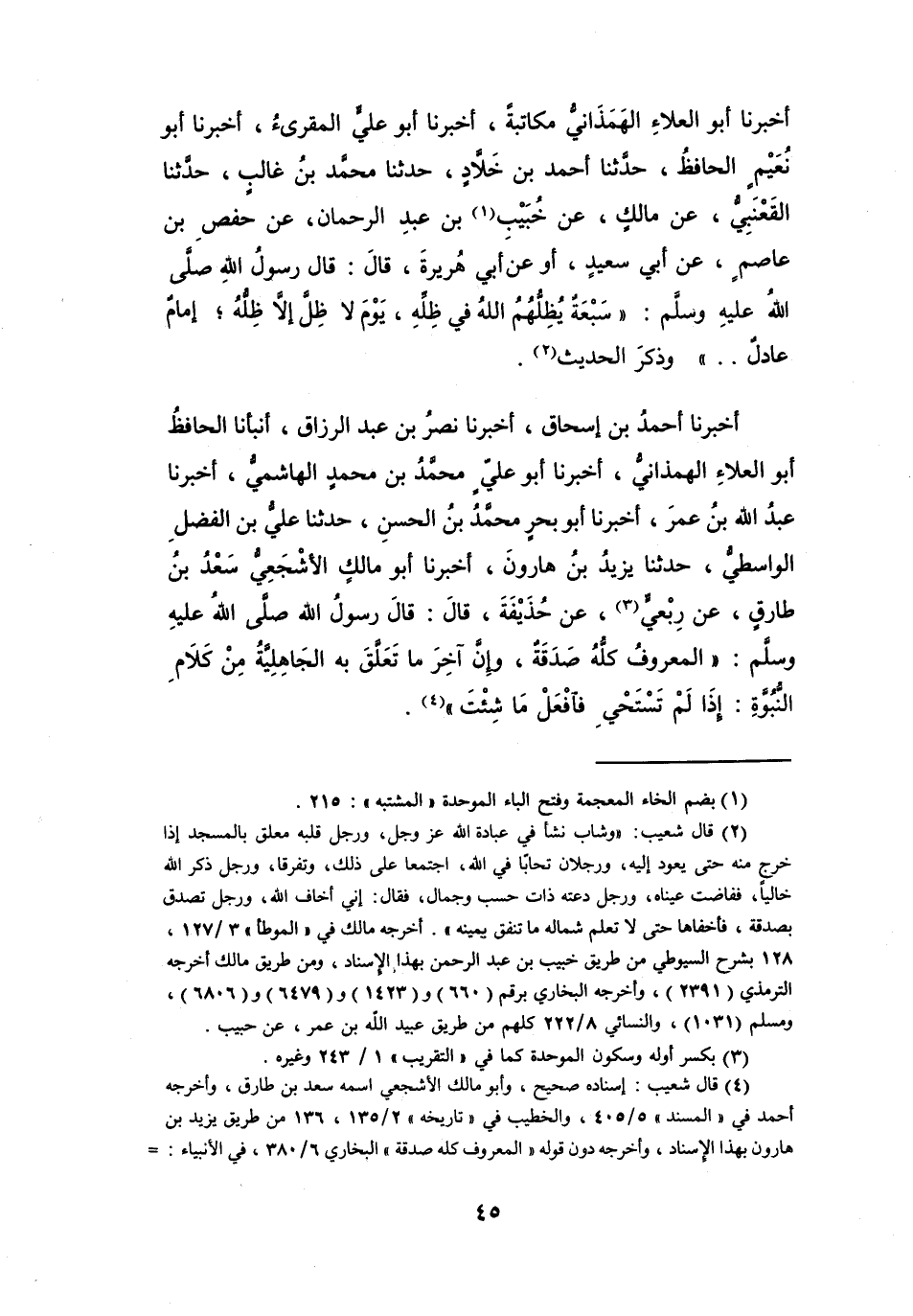 قَالَ رَسُوْلُ اللهِ -صَلَّى اللَّهُ عَلَيْهِ وَسَلَّمَ-: (المَعْرُوْفُ كُلُّهُ صَدَقَةٌ، وَإِنَّ آخِرَ مَا تَعَلَّقَ بِهِ الجَاهِلِيَّةُ مِنْ كَلاَمِ النُّبُوَّةِ: إِذَا لَمْ تَسْتَحِي فَافْعَلْ مَا شِئْتَ) (4) .