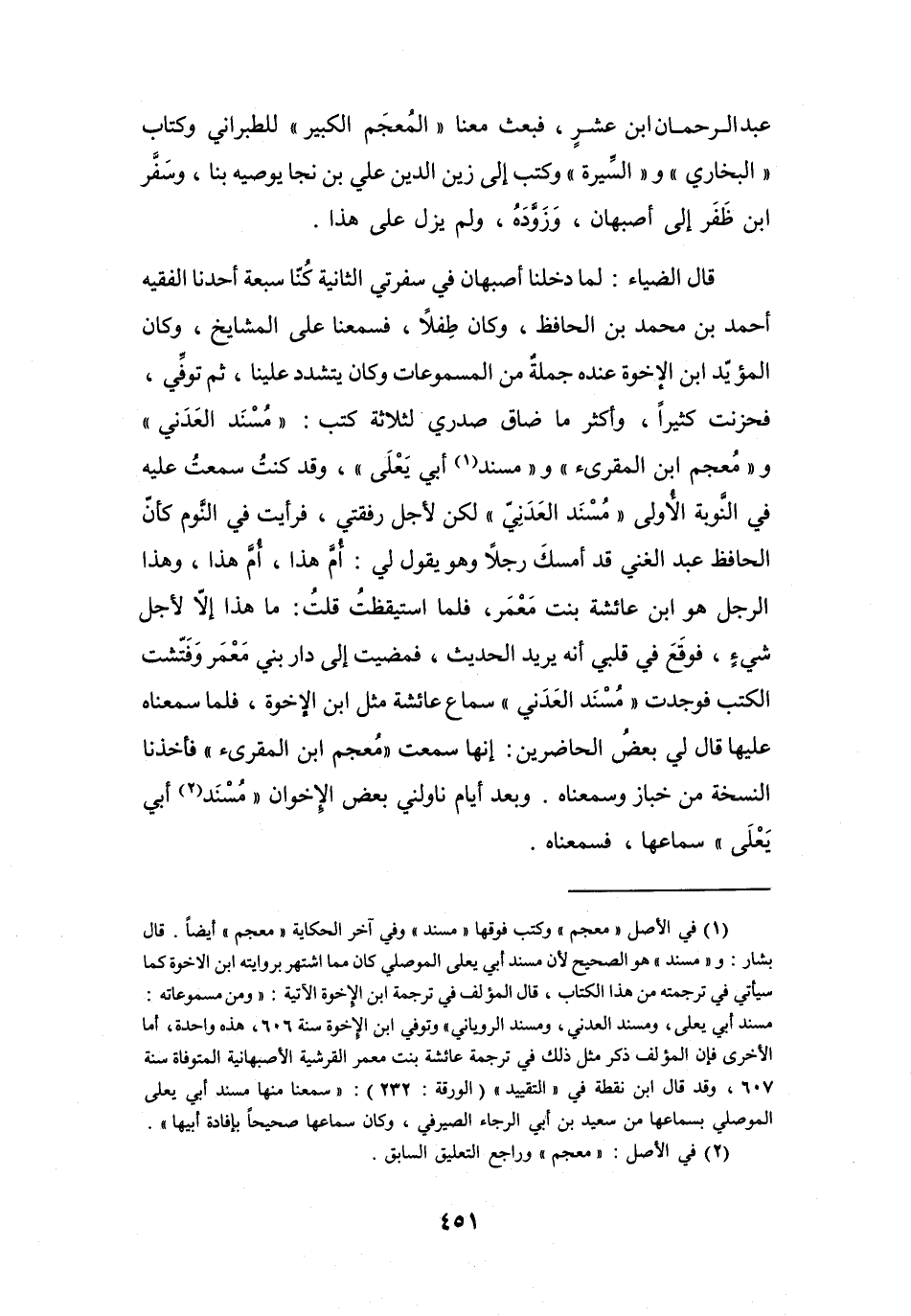 قال بشار: و (مسند) هو الصحيح لان مسند أبي يعلى الموصلي كان مما اشتهر بروايته ابن الاخوة كما سيأتي في ترجمته من هذا الكتاب، قال المؤلف في ترجمة ابن الاخوة الآتية: (ومن مسموعاته: