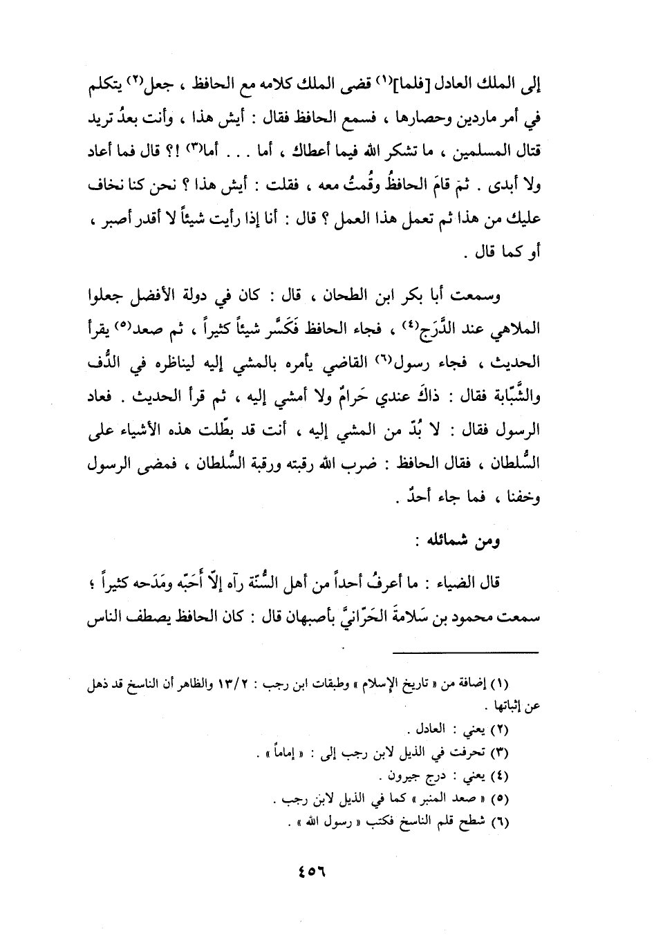 إِلَى الْملك العَادل، فَلَمَّا (1) قضَى الْملك كَلاَمه مَعَ الحَافِظ، جَعَلَ (2) يَتَكَلَّم فِي أَمر مَارْدِيْن وَحصَارهَا، فَسَمِعَ الحَافِظ، فَقَالَ: أَيش هَذَا، وَأَنْت بَعْدُ تُرِيْد قِتَال المُسْلِمِيْنَ، مَا تَشكر الله فِيمَا أَعْطَاك، أَمَا ... أَمَا (3) ؟!