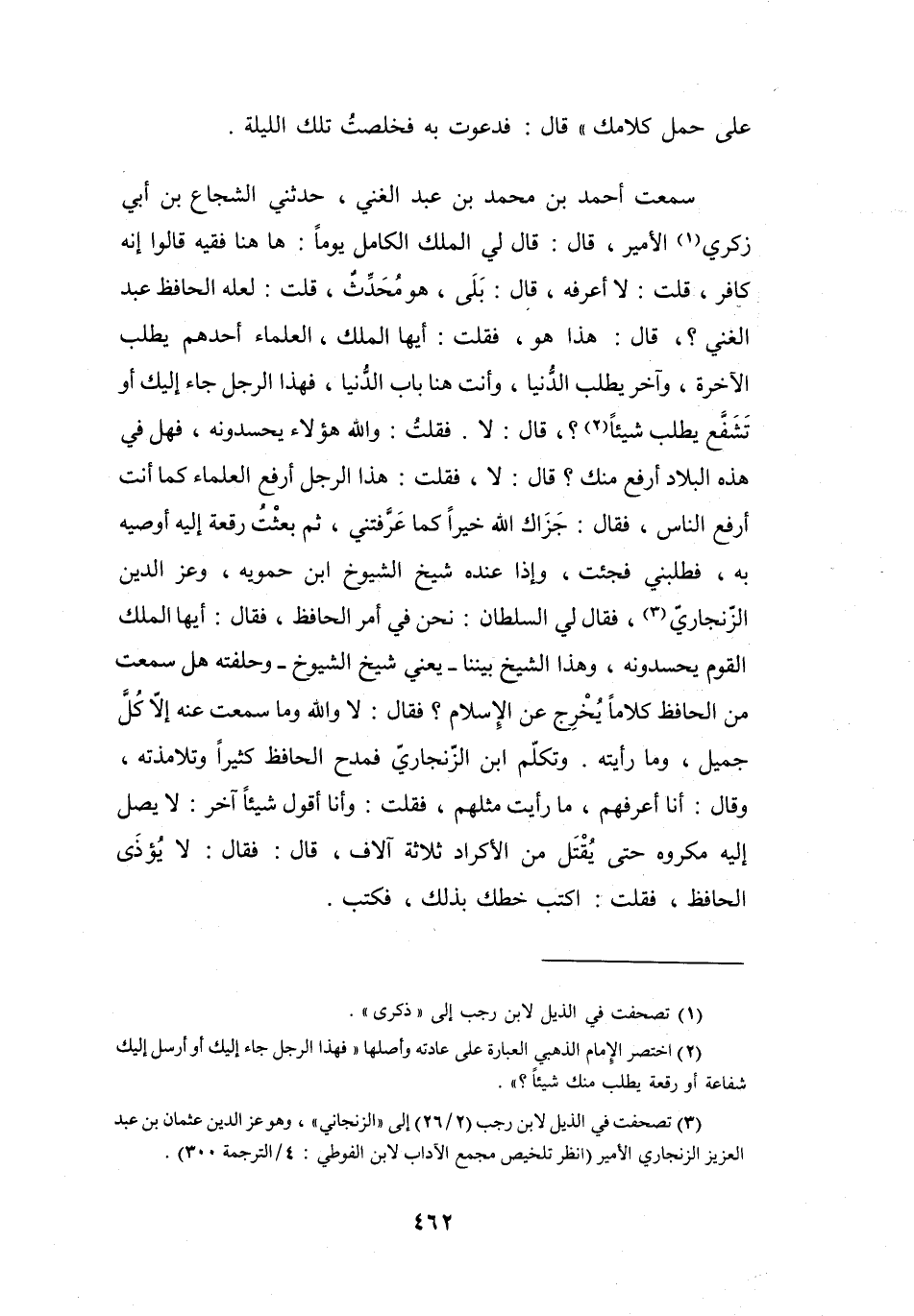 فَقَالَ: جَزَاكَ اللهُ خَيراً كَمَا عَرَّفْتَنِي، ثُمَّ بعثَتُ رقعَة إِلَيْهِ أُوصيه بِهِ، فَطَلبنِي، فَجِئْت، وَإِذَا عِنْدَهُ شَيْخ الشُّيُوْخِ ابْن حَمُّوَيْه، وَعِزّ الدِّيْنِ الزّنجَارِيّ (3) ، فَقَالَ لِي السُّلْطَان: نَحْنُ فِي أَمر الحَافِظ.