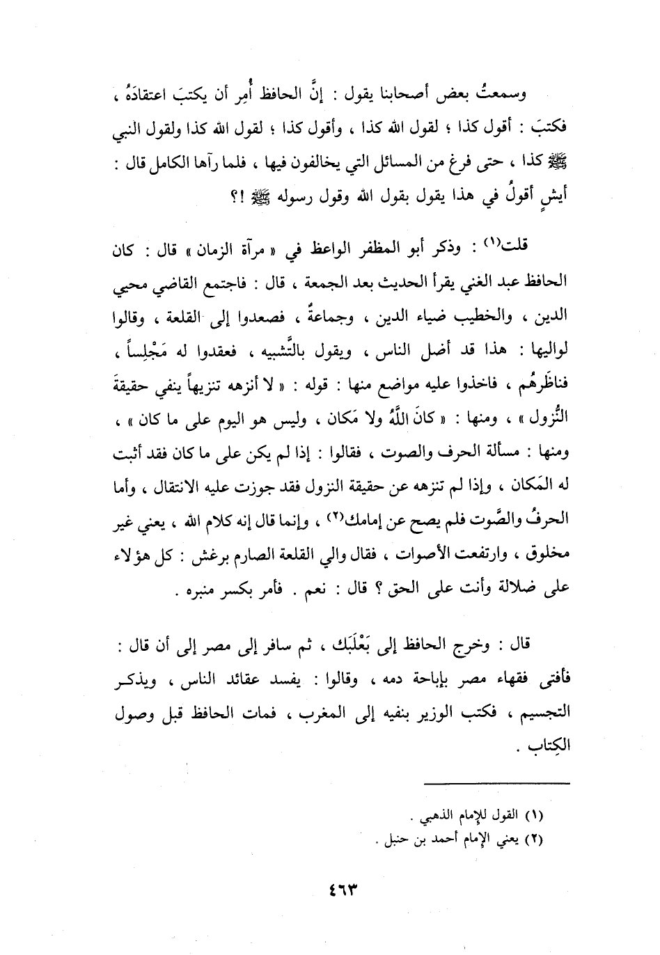 قُلْتُ (1) : وَذَكَرَ أَبُو المُظَفَّرِ الوَاعِظ فِي (مِرَآة الزَّمَانِ) ، قَالَ: كَانَ الحَافِظ عَبْد الغَنِيِّ يَقرَأُ الحَدِيْث بَعْد الجُمُعَة، قَالَ: فَاجْتَمَعَ القَاضِي مُحْيِي الدِّيْنِ، وَالخَطِيْب ضِيَاء الدِّيْنِ، وَجَمَاعَة، فَصعدُوا إِلَى القَلْعَة، وَقَالُوا لوَالِيهَا: هَذَا قَدْ أَضلّ النَّاس، وَيَقُوْلُ بالتّشبيه.