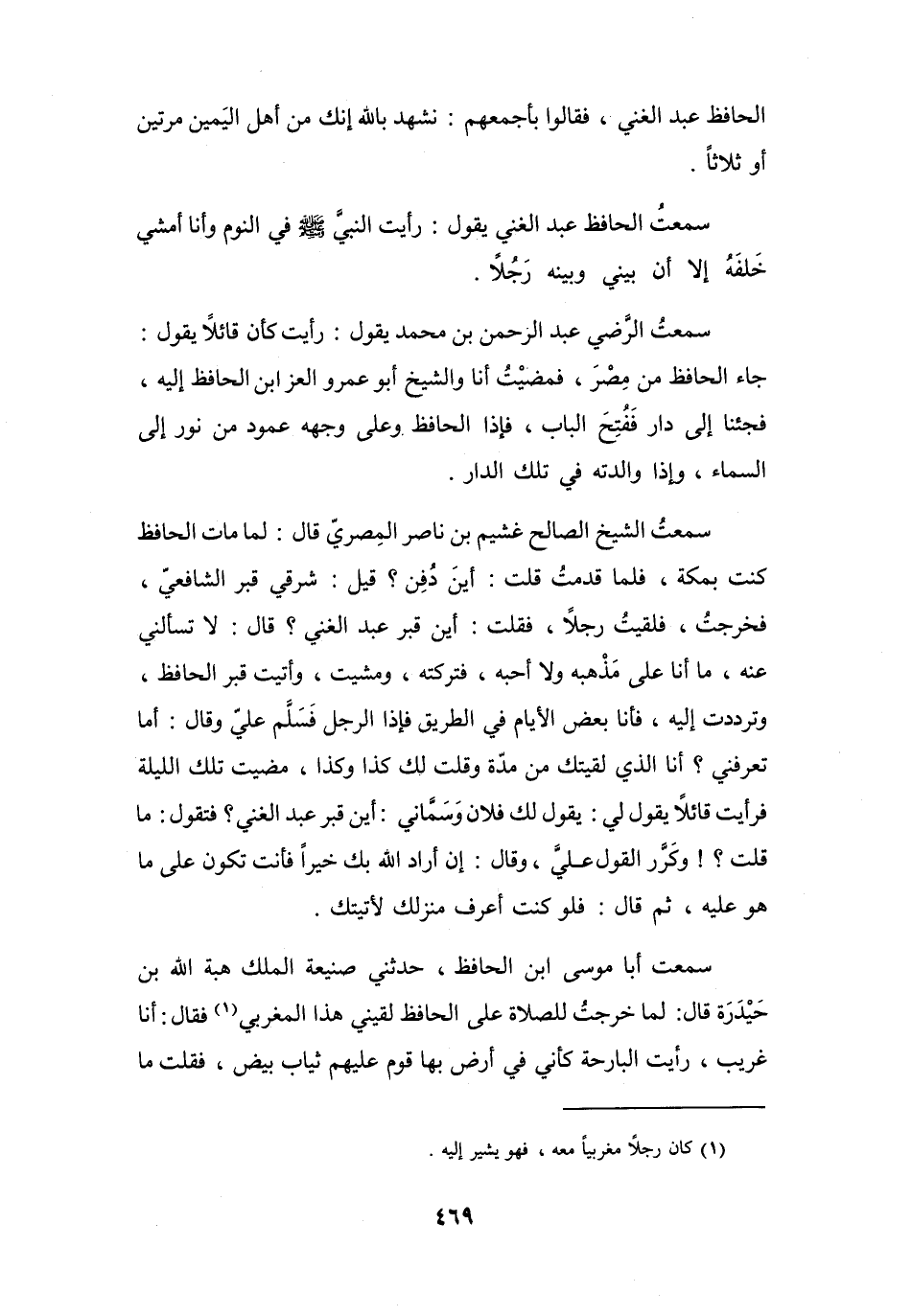 سَمِعْتُ الحَافِظَ عَبْد الغَنِيِّ يَقُوْلُ: رَأَيْتُ النَّبِيّ -صَلَّى اللَّهُ عَلَيْهِ وَسَلَّمَ- فِي النَّوْمِ وَأَنَا أَمْشِي خَلفه إِلاَّ أَنّ بَيْنِي وَبَيْنَهُ رَجُلاً.
