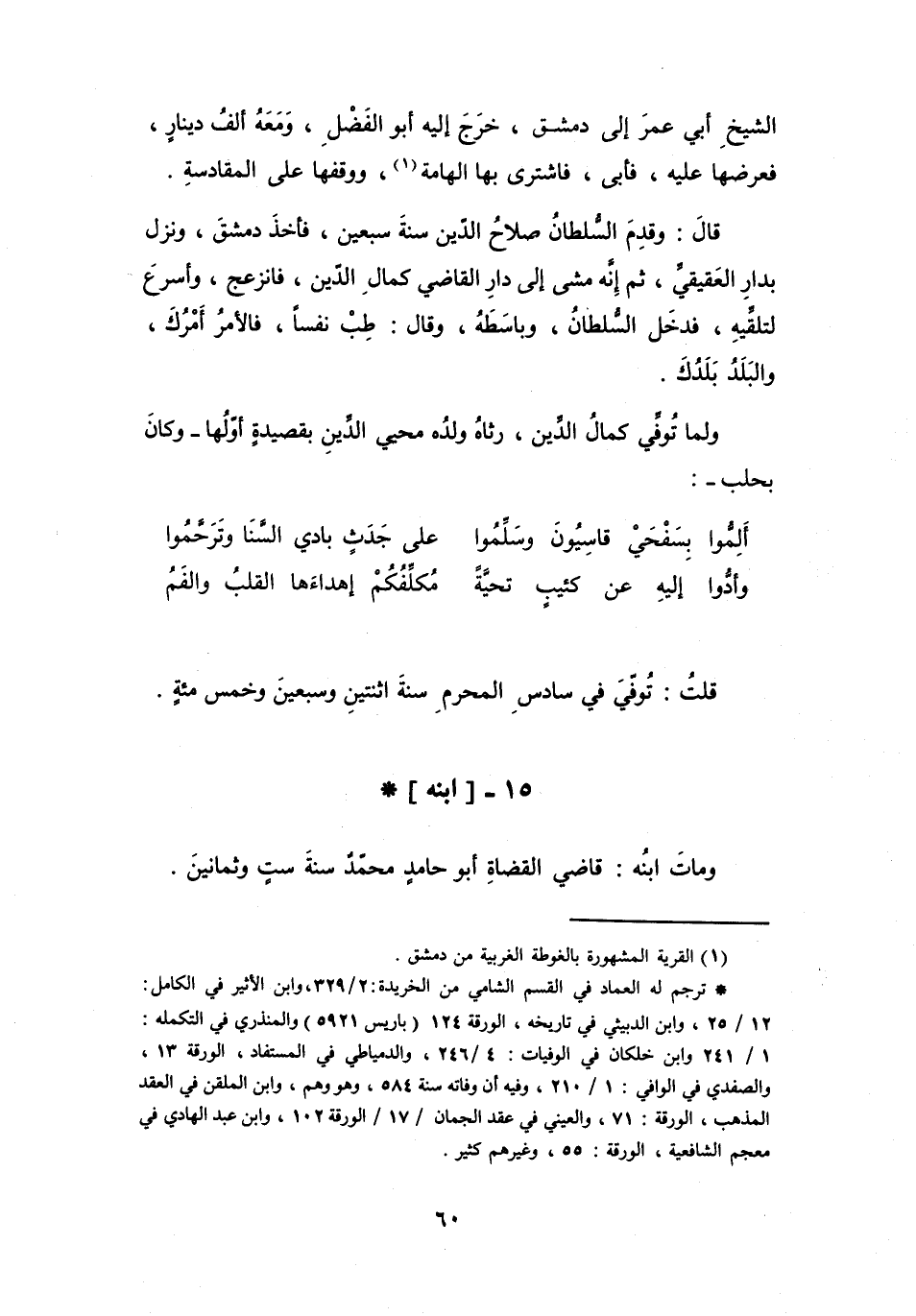 (*) ترجم له العماد في القسم الشامي من الخريدة: 2 / 329، وابن الأثير في الكامل: 12 / 25، وابن الدبيثي في تاريخه، الورقة 124 (باريس 5921) والمنذري في التكمله: 1 / 241 وابن خلكان في الوفيات: 4 / 246، والدمياطي في المستفاد، الورقة 13، والصفدي في الوافي: 1 / 210، وفيه أن وفاته سنة 584، وهو وهم، وابن الملقن في العقد المذهب، الورقة: 71، والعيني في عقد الجمان / 17 / الورقة 102، وابن عبد الهادي في معجم الشافعية، الورقة: 55، وغيرهم كثير.