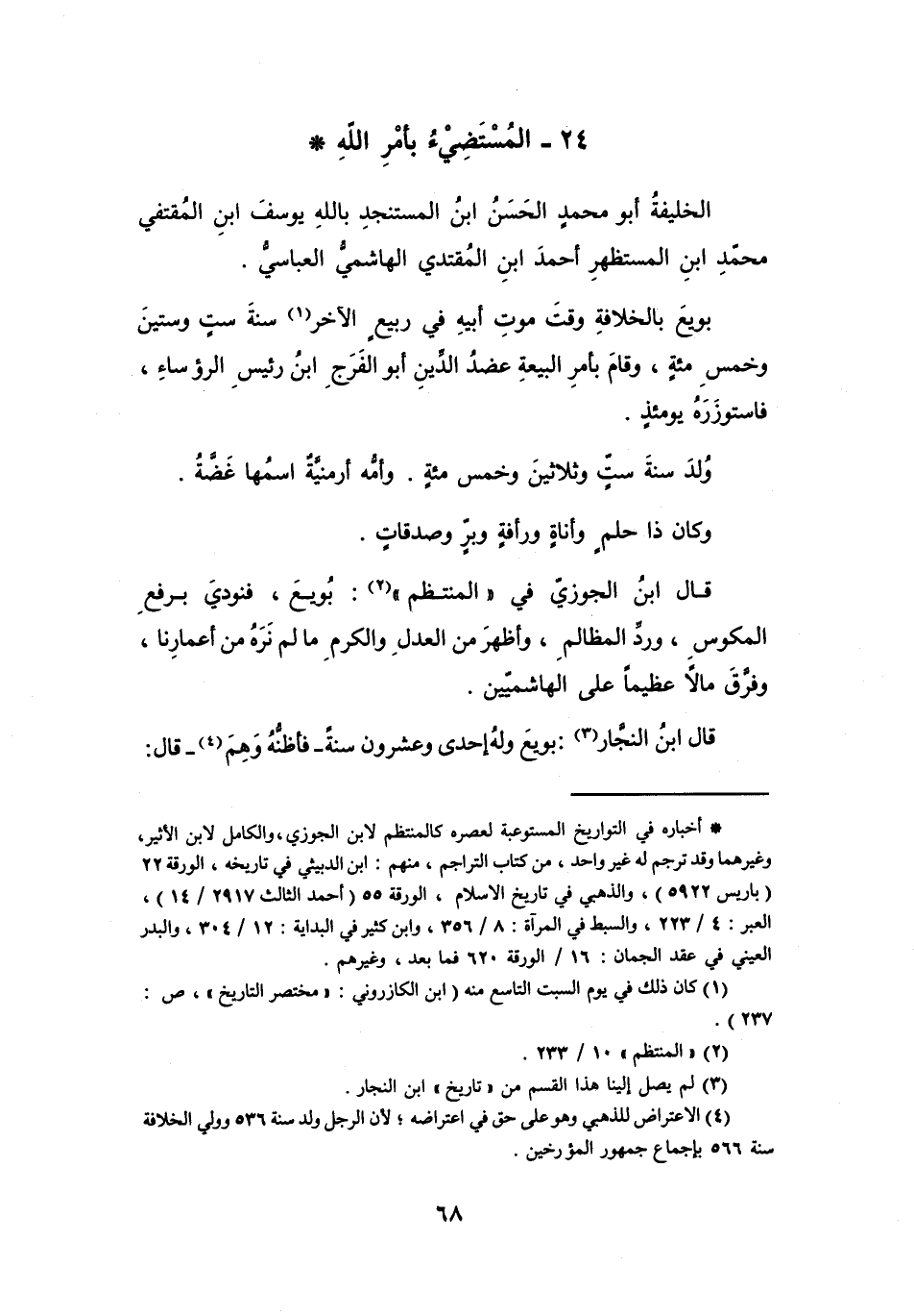 (4) الاعتراض للذهبي وهو على حق في اعتراضه، لان الرجل ولد سنة 536 وولي الخلافة سنة 566 بإجماع جمهور المؤرخين.