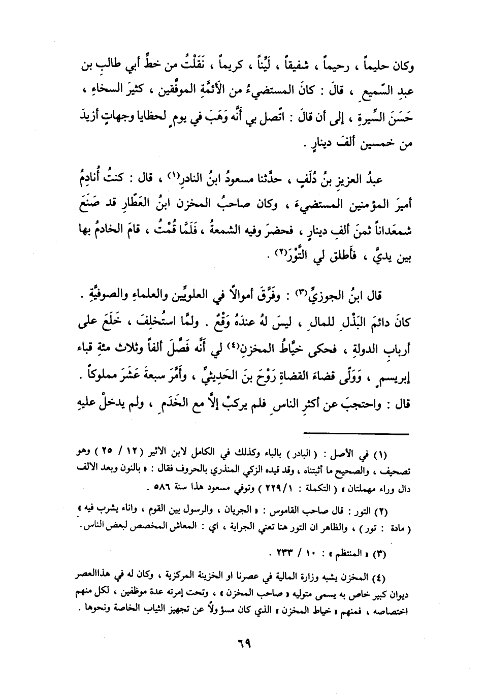 قَالَ ابْنُ الجَوْزِيِّ (3) : وَفرّق أَمْوَالاً فِي الْعلوِيين وَالعُلَمَاء وَالصُّوْفِيَّة.