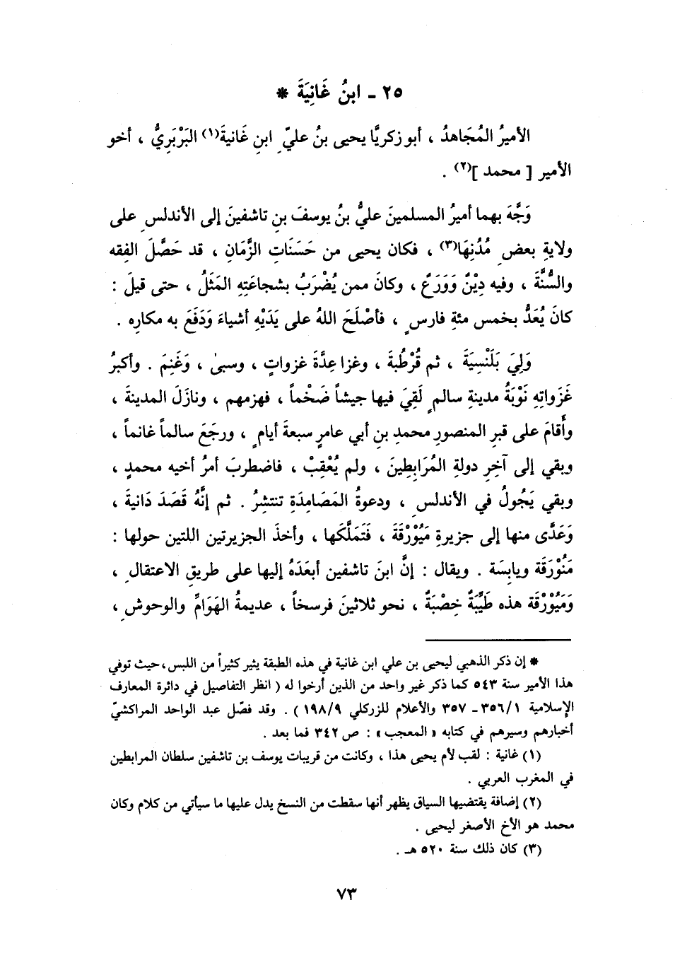 (*) إن ذكر الذهبي ليحيى بن علي ابن غانية في هذه الطبقة يثير كثيرا من اللبس، حيث توفي هذا الأمير سنة 543 كما ذكر غير واحد من الذين أرخوا له (انظر التفاصيل في دائرة المعارف الإسلامية 1 / 357 356 والاعلام للزركلي 9 / 198) .