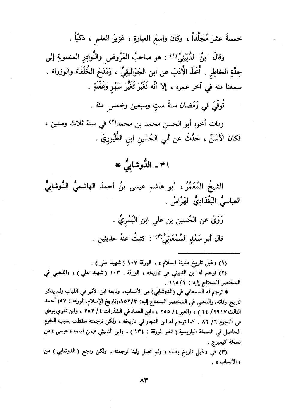 (3) في (ذيل تاريخ بغداد) ولم تصل إلينا ترجمته، ولكن راجع (الدوشابي) من (الأنساب) .