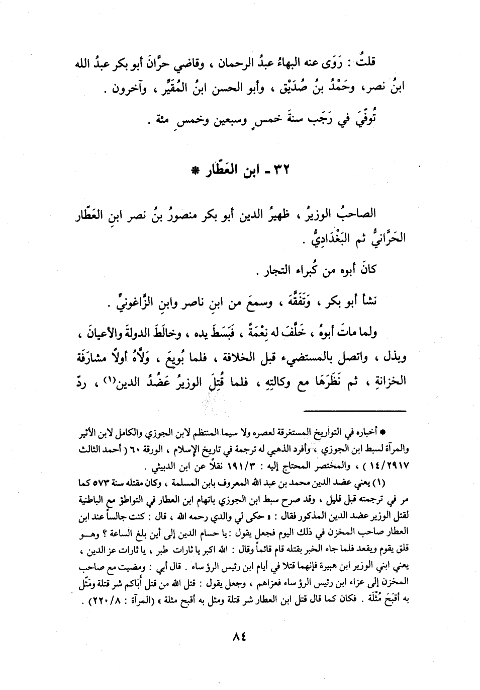 (1) يعني عضد الدين محمد بن عبد الله المعروف بابن المسلمة، وكان مقتله سنة 573 كما مر في ترجمته قبل قليل، وقد صرح سبط ابن الجوزي باتهام ابن العطار في التواطؤ مع الباطنية لقتل الوزير عضد الدين المذكور فقال: (حكى لي والدي رحمه الله، قال: كنت جالسا عند ابن العطار صاحب المخزن في ذلك اليوم فجعل يقول: يا حسام الدين إلى أين بلغ الساعة؟ وهو قلق يقوم ويقعد فلما جاء الخبر بقتله قام قائما وقال: الله اكبر يا ثارات طبر، يا ثارات عز الدين، يعني ابني الوزير ابن هبيرة فإنهما قتلا في أيام ابن رئيس الرؤساء.