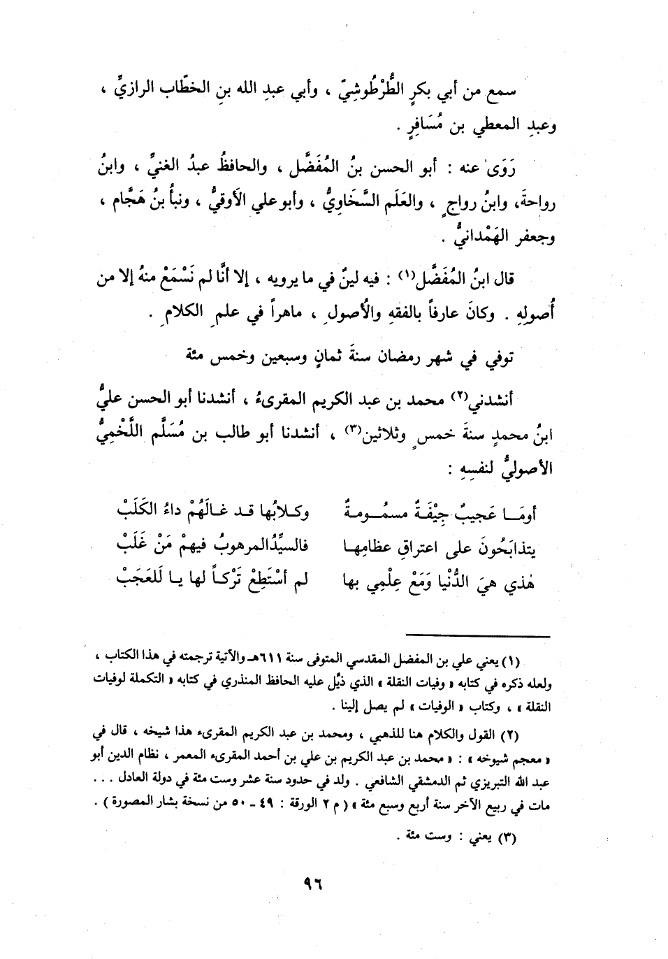 (1) يعني علي بن المفضل المقدسي المتوفى سنة 611 هـ والآتية ترجمته في هذا الكتاب، ولعله ذكره في كتابه (وفيات النقلة) الذي ذيل عليه الحافظ المنذري في كتابه (التكملة لوفيات النقلة) ، وكتاب (الوفيات) لم يصل إلينا.