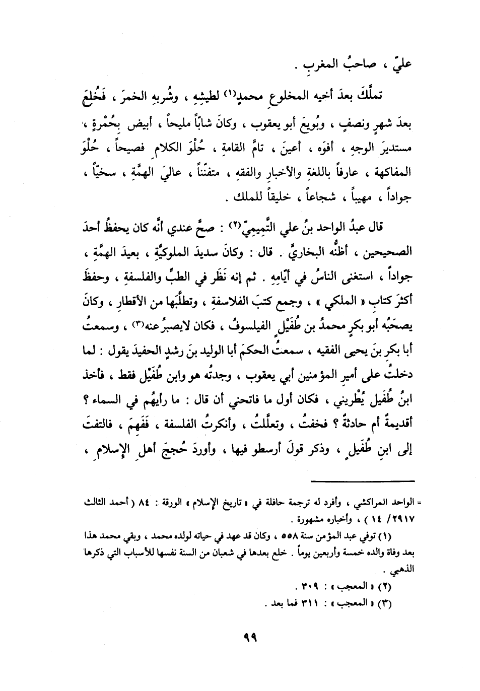 = الواحد المراكشي، وأفرد له ترجمة حافلة في (تاريخ الإسلام) الورقة: 84 (أحمد الثالث 2917 / 14) ، وأخباره مشهورة.