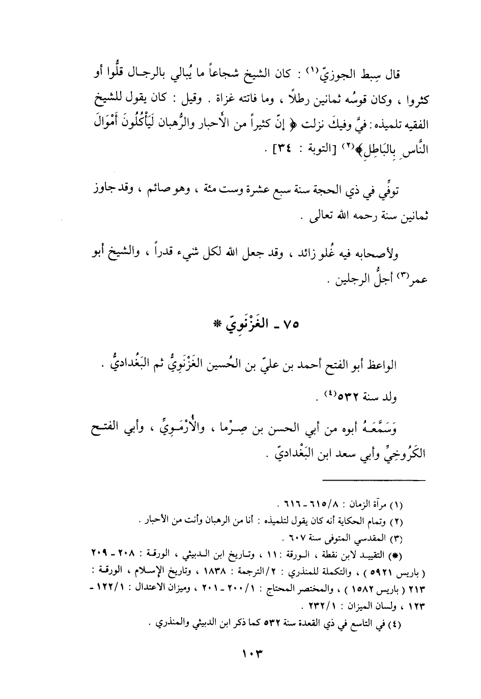 (*) التقييد لابن نقطة، الورقة: 11، وتاريخ ابن الدبيثي، الورقة: 208 - 209 (باريس 5921) ، والتكملة للمنذري: 2 / الترجمة: 1838، وتاريخ الإسلام، الورقة 213 (باريس 1582) ، والمختصر المحتاج: 1 / 200 - 201، وميزان الاعتدال: 1 / 122 - 123، ولسان الميزان: 1 / 232.
