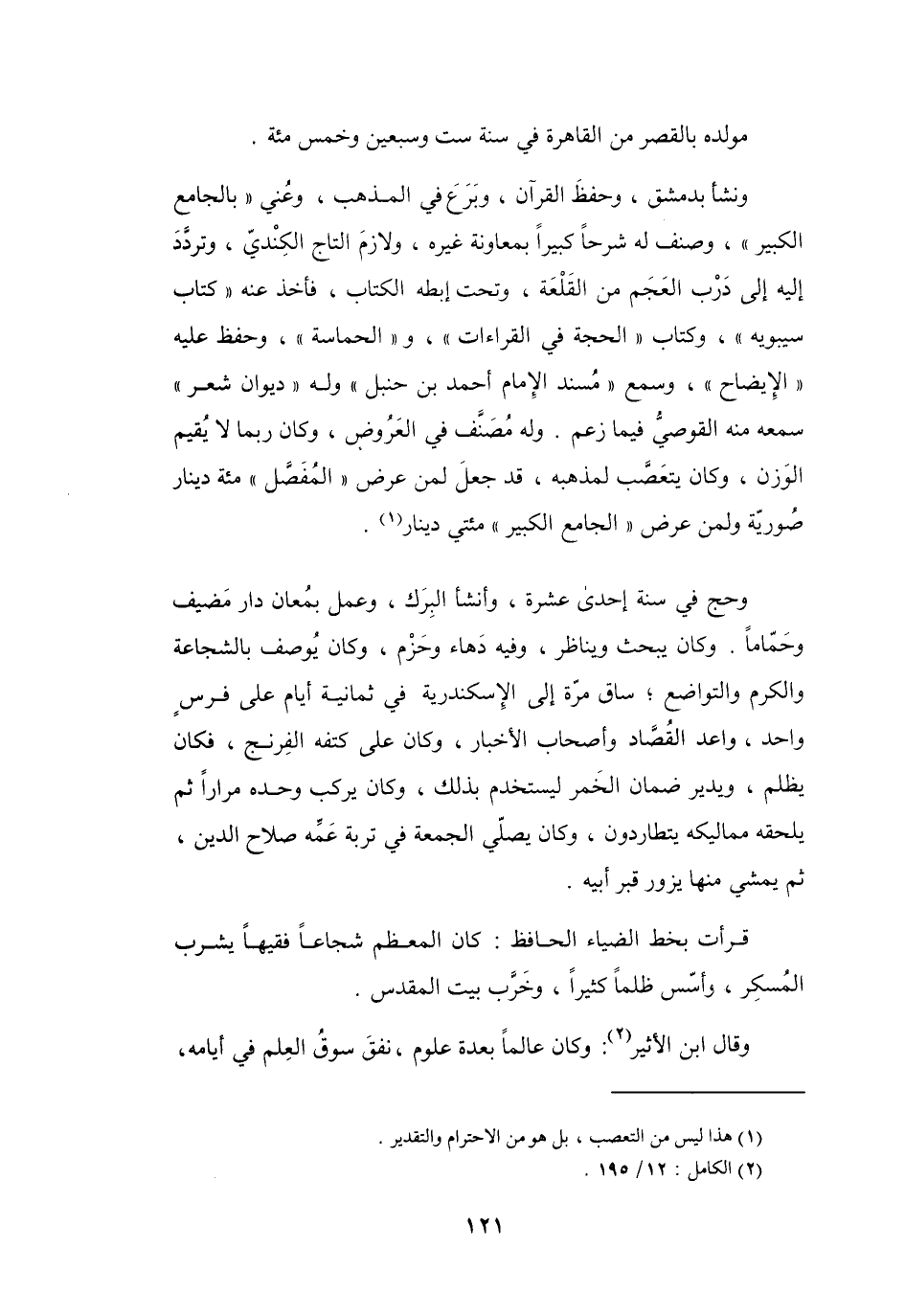 وَلَهُ مصَنّف فِي الْعرُوض، وَكَانَ رُبَّمَا لاَ يُقيم الْوَزْن، وَكَانَ يَتعصّب لمَذْهَبه، قَدْ جَعَلَ لِمَنْ عرض (المُفَصّل) مائَة دِيْنَارٍ صُوْرِيّة وَلِمَنْ عرض (الجَامِع الكَبِيْر) مائَتَيْ دِيْنَار (1) .
