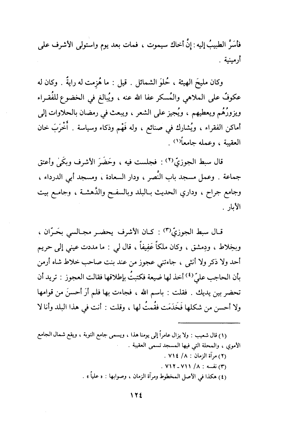 قَالَ سِبْطُ الجَوْزِيِّ (3) : كَانَ الأَشْرَف يَحضُرُ مَجَالِسِي بِحَرَّانَ، وَبِخِلاَطٍ، وَدِمَشْقَ، وَكَانَ مَلِكاً عَفِيْفاً، قَالَ لِي: مَا مَددتُ عَيْنِي إِلَى حَرِيْمِ أَحَدٍ، وَلاَ ذَكرٍ وَلاَ أُنْثَى، جَاءتْنِي عَجُوْزٌ مِنْ عِنْدِ بِنْتِ صَاحِبِ خِلاَطٍ شَاه أَرْمَن بِأَنَّ الحَاجِبَ عَلِيّاً (4) أَخَذَ لَهَا ضَيعَةً، فَكَتَبتُ بِإِطلاَقهَا.