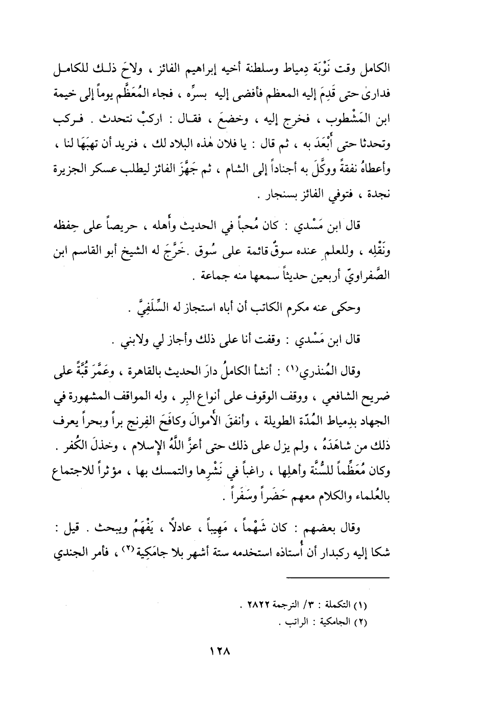 وَقَالَ المُنْذِرِيّ (1) : أَنشَأَ الكَامِل دَار الحَدِيْث بِالقَاهِرَةِ، وَعَمَّر قُبَّة عَلَى ضَرِيْح الشَّافِعِيّ، وَوَقَفَ الوُقُوْف عَلَى أَنْوَاع البِرّ، وَلَهُ الموَاقف المَشْهُوْرَة فِي الجِهَادِ بدِمْيَاط المُدَّة الطَّوِيْلَة، وَأَنفق الأَمْوَال، وَكَافح الفِرَنْج برّاً وَبَحْراً، يعرف ذَلِكَ منْ شَاهده، وَلَمْ يَزَلْ عَلَى ذَلِكَ حَتَّى أَعزّ الله الإِسْلاَم، وَخذل الكُفْر.