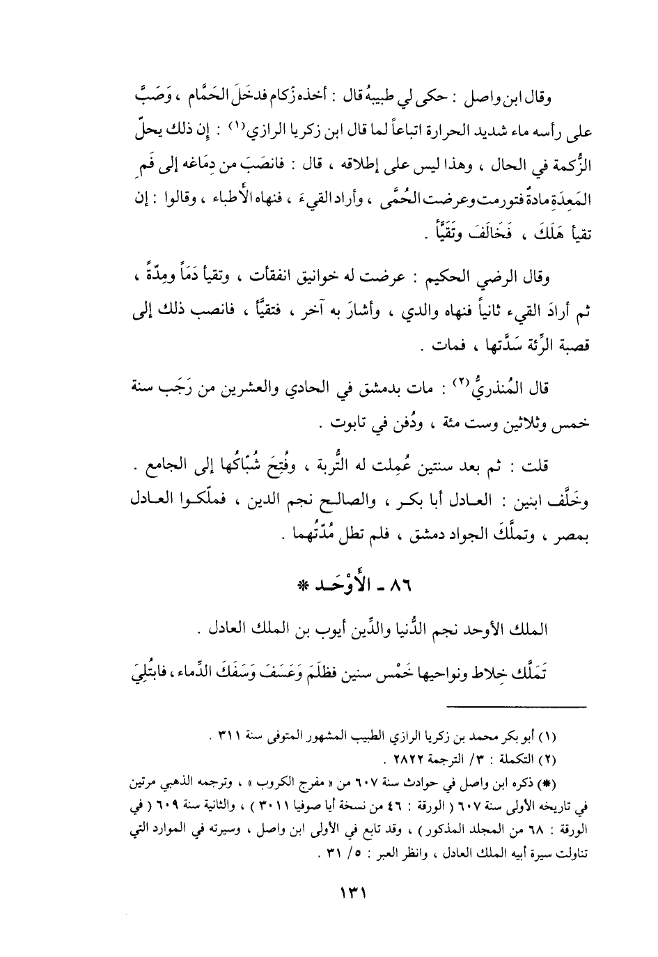(*) ذكره ابن واصل في حوادث سنة 607 من " مفرج الكروب "، وترجمه الذهبي مرتين في تاريخه الأولى سنة 607 (الورقة 46 من نسخة أيا صوفيا 3011) ، والثانية سنة 609 (في الورقة: 68 من المجلد المذكور) ، وقد تابع في الأولى ابن واصل، وسيرته في الموارد التي تناولت سيرة أبيه الملك العادل، وانظر العبر: 5 / 31.