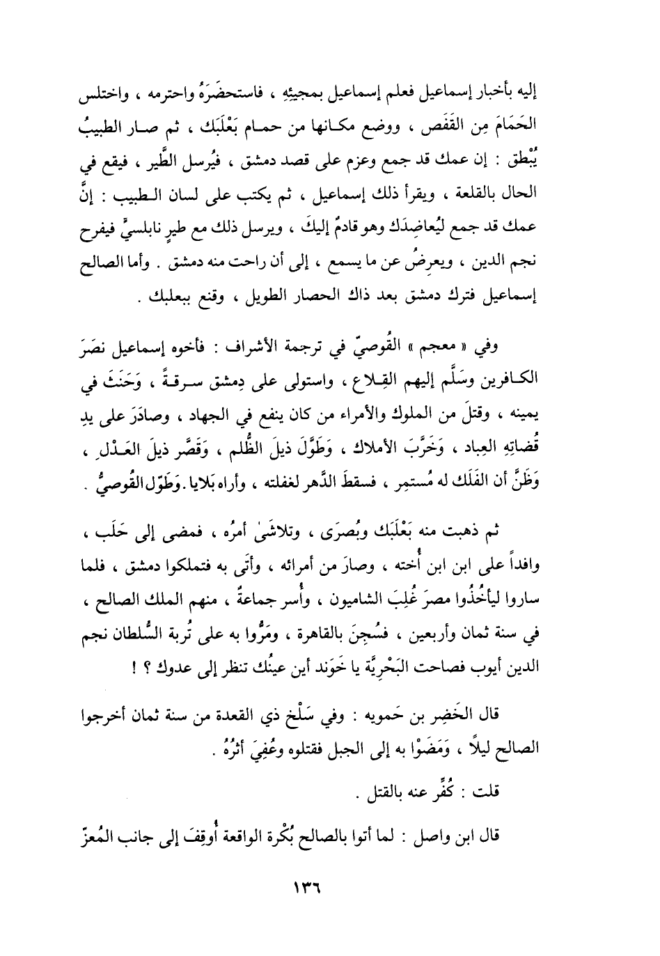 وَيُرسل ذَلِكَ مَعَ طيرٍ نَابُلُسِيٍّ، فَيفرح نَجْم الدِّيْنِ، وَيَعرِضُ عَنْ مَا يَسْمَع، إِلَى أَنْ رَاحت مِنْهُ دِمَشْق، وَأَمَّا الصَّالِح إِسْمَاعِيْل، فَترك دِمَشْق بَعْد ذَاكَ الحصَار الطَّوِيْل، وَقنع بِبَعْلَبَكَّ.