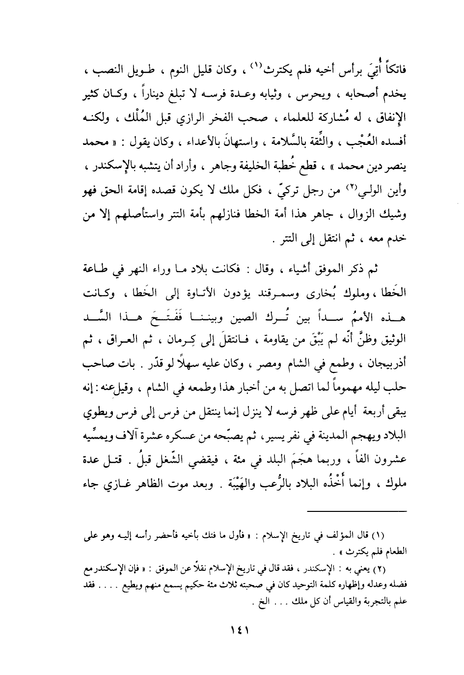 (2) يعني به: الاسكندر، فقد قال في تاريخ الإسلام نقلا عن الموفق: " فإن الاسكندر مع فضله وعدله وإظهاره كلمة التوحيد كان في صحبته ثلاث مئة حكيم يسمع منهم ويطيع ... فقد علم بالتجربة والقياس أن كل ملك ... الخ.