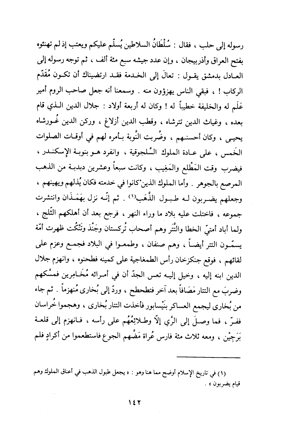 وَأَمَّا المُلُوْك الَّذِيْنَ كَانُوا فِي خِدْمَته، فَكَانَ يُذلهم وَيُهينهُم، وَجَعَلهُم يَضربُوْنَ لَهُ طبُول الذَّهَب (1) ، ثُمَّ إِنَّهُ نَزل بِهَمَذَانَ، وَانتشرت جُمُوْعه، فَاختلت عَلَيْهِ بلاَد مَا وَرَاء النَّهْر، فَرَجَعَ بَعْدَ أَنْ أَهْلكهُم الثَّلج، وَلَمَّا أَبَاد أُمَّتَيّ الخَطَا وَالتَّتَر وَهُم أَصْحَاب تُركستَان وَجَنْد وَتَنْكُت ظَهرت أُمَّة يُسَمَّوْنَ التّتر أَيْضاً، وَهُم صنفَان، وَطمعُوا فِي البِلاَد، فَجمعَ، وَعَزَمَ عَلَى لِقَائِهِم، فَوَقَعَ جِنْكِزْ خَان رَأْس الطمغَاجيَّة عَلَى كَمِينه، فَطَحنوهُ، وَانْهَزَم جَلاَل الدِّيْنِ ابْنه إِلَيْهِ، وَخيل إِلَيْهِ تَعس الجدّ أَنَّ فِي أُمَرَائِهِ مُخَامِرِيْنَ، فَمسَّكهُم، وَضربَ مَعَ التَّتَار مَصَافّاً بَعْد آخر، فَتطحطح، وَردّ إِلَى بُخَارَى مُنْهَزِماً.
