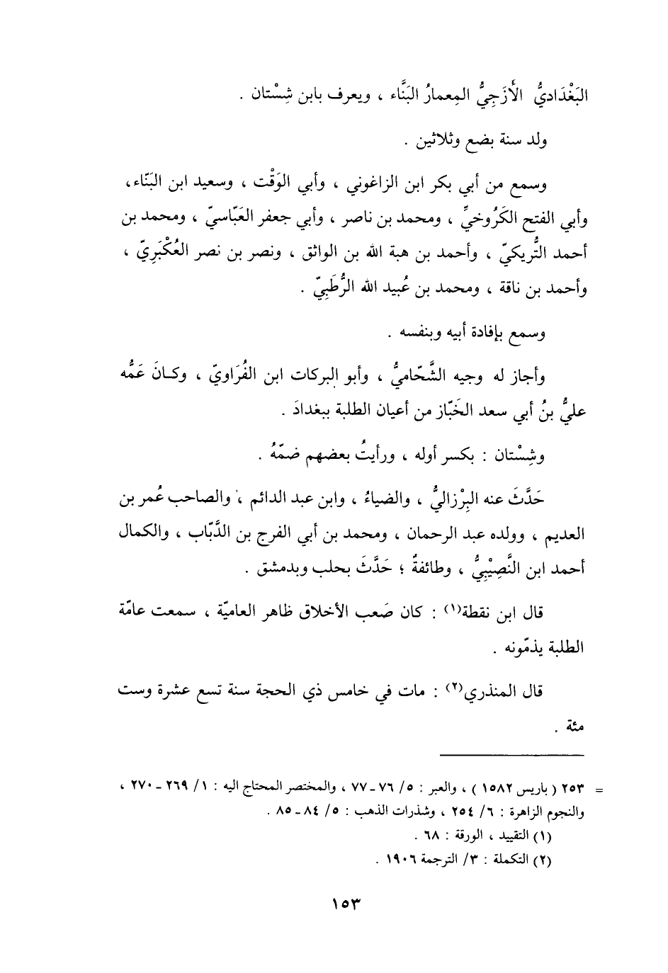 البَغْدَادِيُّ، الأَزَجِيُّ، المِعمارُ، البَنَّاءُ، وَيُعْرَفُ: بِابْنِ شِسْتَانَ.