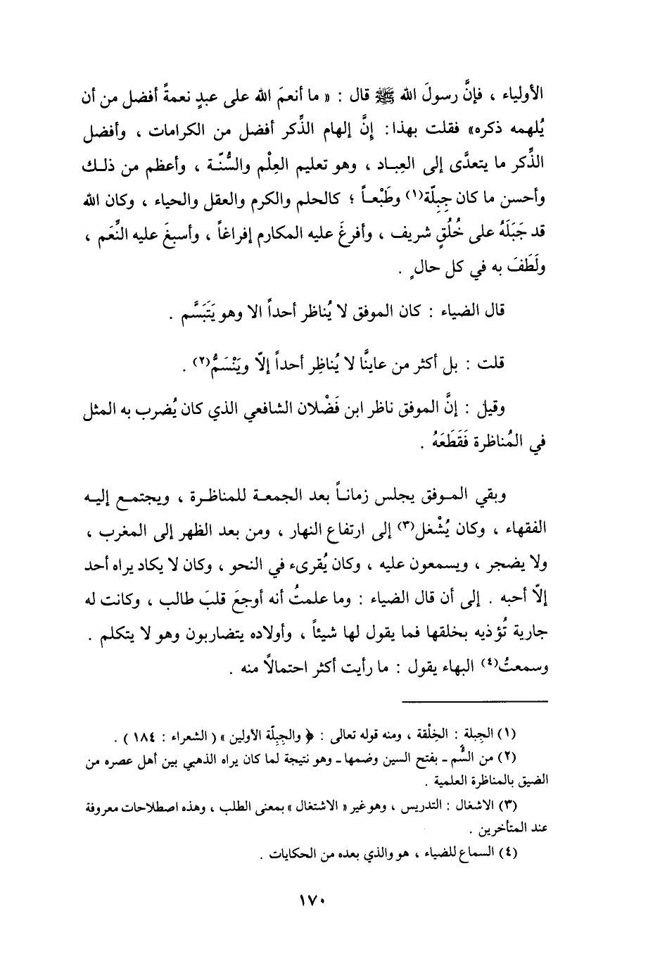 وَبَقِيَ المُوَفَّقُ يَجْلِسُ زَمَاناً بَعْد الجُمُعَةِ لِلمُنَاظَرَةِ، وَيَجْتَمِعُ إِلَيْهِ الفُقَهَاءُ، وَكَانَ يُشغلُ (3) إِلَى ارْتفَاعِ النَّهَارِ، وَمِنْ بَعْدِ الظُّهْرِ إِلَى المَغْرِبِ وَلاَ يَضجَرُ، وَيَسَمَعُوْنَ عَلَيْهِ، وَكَانَ يُقرِئُ فِي النَّحْوِ، وَكَانَ لاَ يَكَادُ يَرَاهُ أَحَدٌ إِلاَّ أَحَبَّهُ ... ، إِلَى أَنْ قَالَ الضِّيَاءُ: