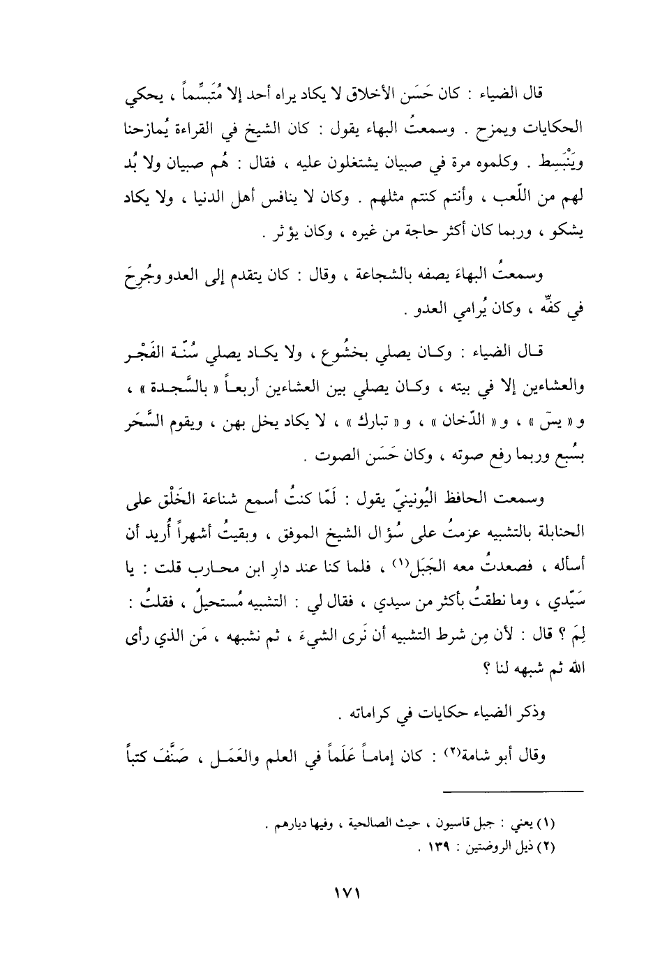 وَسَمِعْتُ الحَافِظَ اليُوْنِيْنِيَّ يَقُوْلُ: لَمَّا كُنْتُ أَسْمَعُ شنَاعَةَ الخَلْقِ عَلَى الحَنَابِلَةِ بِالتَّشْبِيْهِ، عزمتُ عَلَى سُؤَالِ الشَّيْخِ المُوَفَّقِ، وَبقيتُ أَشهراً أُرِيْدُ أَنْ أَسألَهُ، فَصعدتُ مَعَهُ الجبلَ (1) ، فَلَمَّا كُنَّا عِنْدَ دَارِ ابْنِ مُحَارِبٍ قُلْتُ: يَا سيِّدِي، وَمَا نطقتُ بِأَكْثَرَ مِنْ سيِّدِي، فَقَالَ لِي: التَّشبيهُ مُسْتحيلٌ.