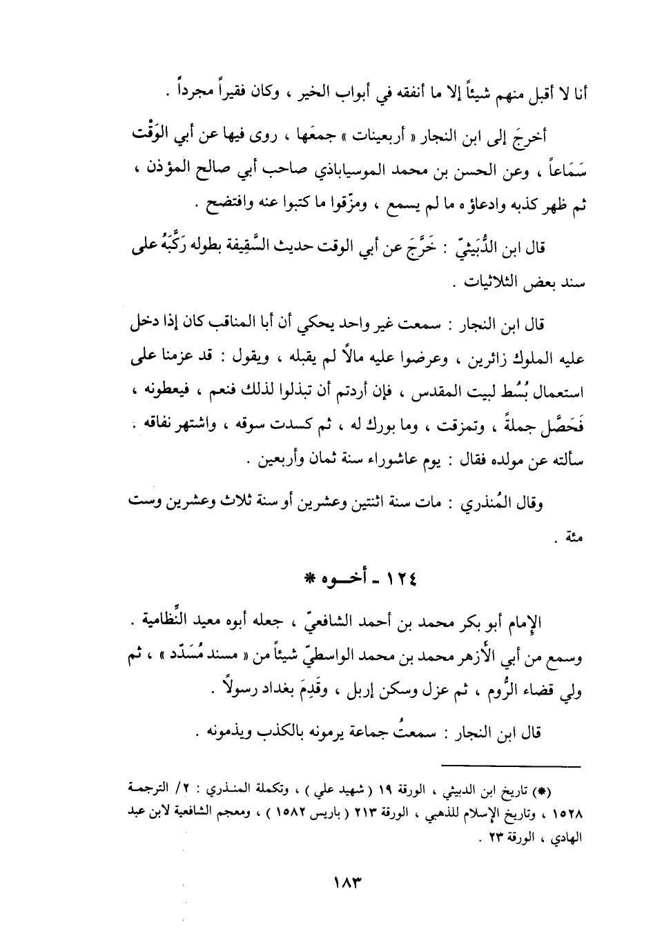 (*) تاريخ ابن الدبيثي، الورقة 19 (شهيد علي) ، وتكملة المنذري: 2 / الترجمة 1528، وتاريخ الإسلام للذهبي، الورقة 213 (باريس 1582) ، ومعجم الشافعية لابن عبد الهادي، الورقة 23.