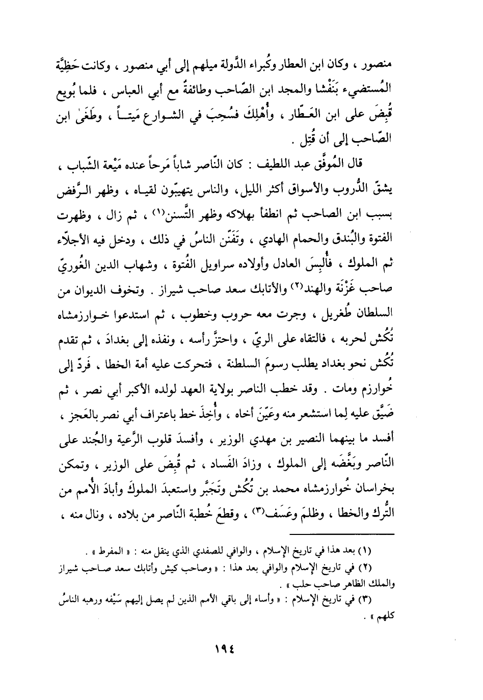 (2) في تاريخ الإسلام والوافي بعد هذا: " وصاحب كيش وأتابك سعد صاحب شيراز والملك الظاهر صاحب حلب ".