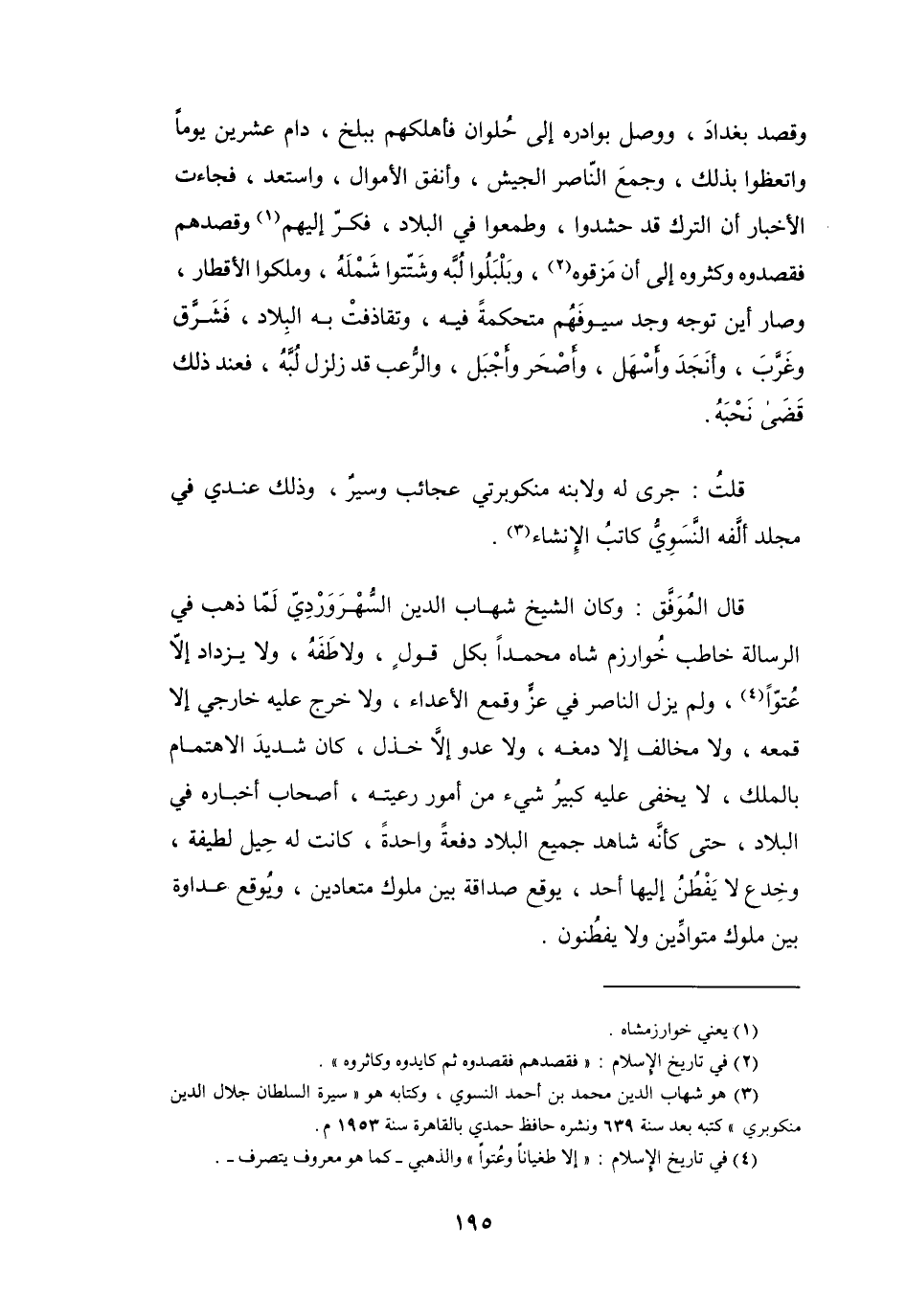 (3) هو شهاب الدين محمد بن أحمد النسوي، وكتابه هو " سيرة السلطان جلال الدين منكوبري " كتبه بعد سنة 639 ونشره حافظ حمدي بالقاهرة سنة 1953 م.