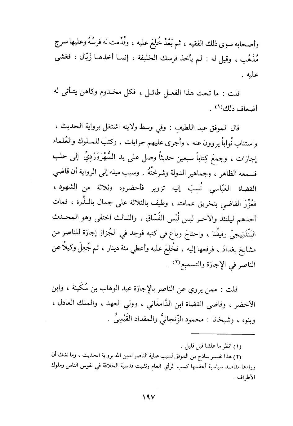 (2) هذا تفسير ساذج من الموفق لسبب عناية الناصر لدين الله برواية الحديث، ومانشك أن وراءها مقاصد سياسية أعظمها كسب الرأي العام وتثبيت قدسية الخلافة في نفوس الناس وملوك الاطراف.