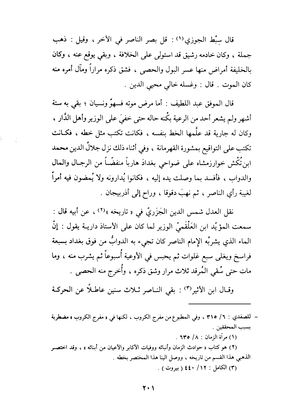 سَمِعْتُ المُؤَيَّد ابْن العَلْقَمِيّ الوَزِيْر لَمَّا كَانَ عَلَى الأُسْتَاذ دَارِيَة يَقُوْلُ: إِنَّ المَاء الَّذِي يَشرَبُه الإِمَام النَّاصِر كَانَ تَجِيْء بِهِ الدَّوَابّ مِنْ فَوْقَ بَغْدَاد بِسَبْعَة فَرَاسخ وَيغلَى سَبْع غلوَات ثُمَّ يحبس فِي الأَوعيَة أُسْبُوْعاً ثُمَّ يَشرب مِنْهُ، وَمَا مَاتَ حَتَّى سقِي المُرقد ثَلاَث مرَار وَشق ذَكَرَهُ، وَأُخْرِج مِنْهُ الحصَى.