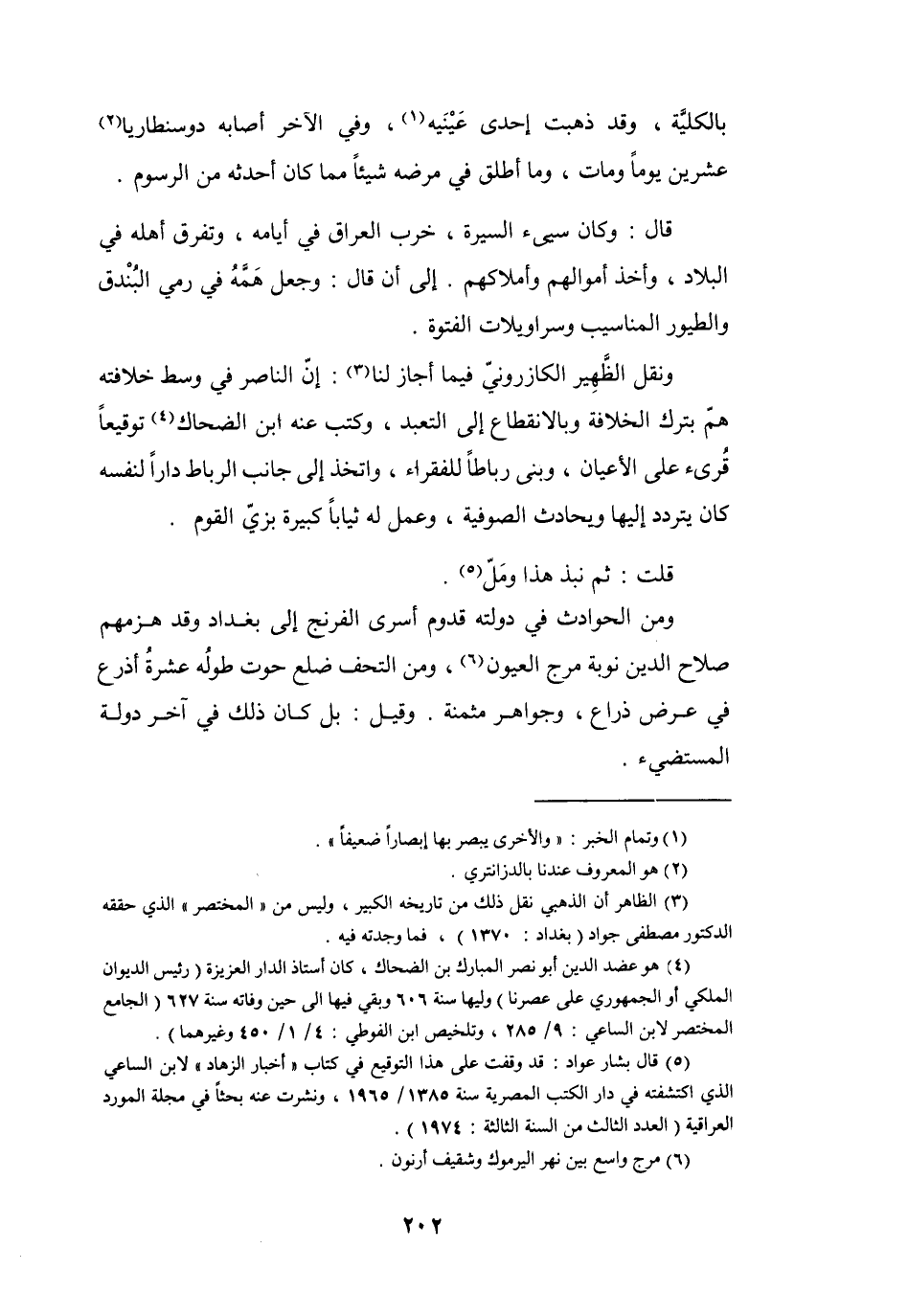 (5) قال بشار عواد: قد وقفت على هذا التوقيع في كتاب " أخبار الزهاد " لابن الساعي الذي اكتشفته في دار الكتب المصرية سنة 1385 / 1965، ونشرت عنه بحثا في مجلة المورد العراقية (العدد الثالث من السنة الثالثة: 1974) .