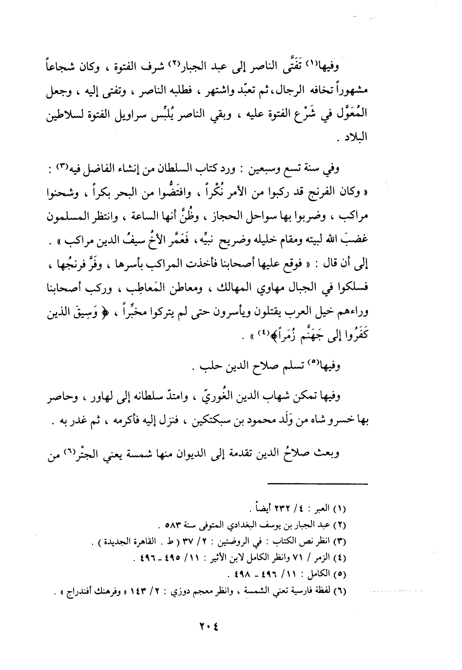 وَفِيْهَا (1) : تَفَتَّى النَّاصِرُ إِلَى عَبْدِ الجَبَّارِ (2) شَرفَ الفُتوَّةِ، وَكَانَ شُجَاعاً مَشْهُوْراً تَخَافُه الرِّجَالُ، ثُمَّ تَعبَّدَ وَاشْتهرَ، فَطَلَبَهُ النَّاصِرُ، وَتَفَتَّى إِلَيْهِ، وَجَعَلَ المُعَوَّل فِي شَرْعِ الفُتُوَّةِ عَلَيْهِ، وَبَقِيَ النَّاصِرُ يُلبِّسُ سَرَاويلَ الفُتُوَّةِ لِسلاَطينِ البِلاَدِ.