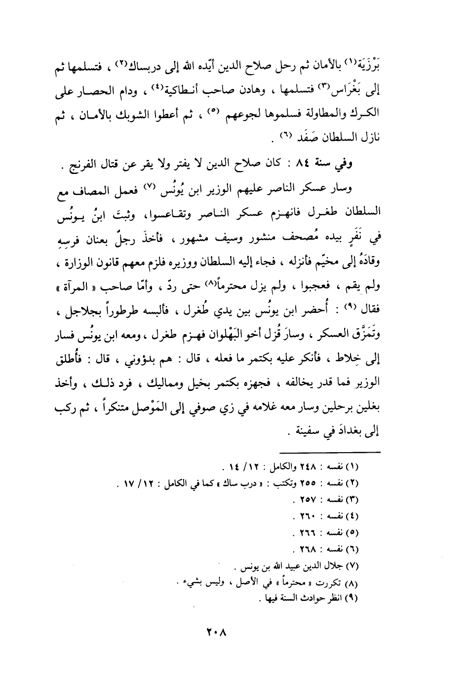 وَفِي سَنَةِ 84: كَانَ صَلاَحُ الدِّيْنِ لاَ يَفترُ وَلاَ يقرُّ عَنْ قِتَالِ الفِرَنْجِ، وَسَارَ عَسْكَرُ النَّاصِرِ عَلَيْهِم الوَزِيْرُ ابْنُ يُوْنُسَ (7) ، فَعملَ المَصَافَّ مَعَ السُّلْطَانِ طُغْرِلَ، فَانْهَزَمَ عَسْكَرُ النَّاصِرِ، وَتَقَاعسُوا، وَثبتَ ابْنُ يُوْنُسَ فِي نَفَرٍ، بِيَدِهِ مُصحفٌ مَنْشُوْرٌ وَسيفٌ مَشْهُوْرٌ، فَأَخَذَ رَجُلٌ بعِنَانِ فَرسِهِ، وَقَادَهُ إِلَى مخيَّمٍ، فَأَنْزَلَهُ، فَجَاءَ إِلَيْهِ السُّلْطَانُ وَوزِيْرُه، فَلزمَ مَعَهُم قَانُوْنَ الوزَارَةِ، وَلَمْ يَقمْ، فَعجبُوا، وَلَمْ يَزَلْ محترماً (8) حَتَّى ردَّ.