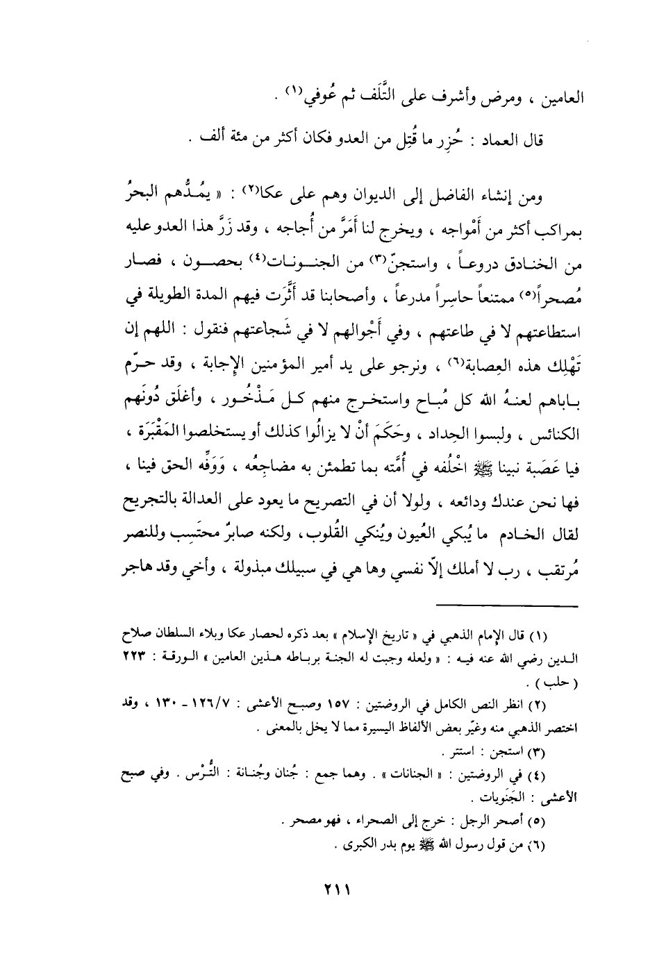 وَمِنْ إِنشَاءِ الفَاضِلِ إِلَى الدِّيْوَانِ وَهُم عَلَى عَكَّا (2) : يَمُدُّهُمُ البَحْرُ بِمَرَاكِبَ أَكْثَرَ مِنْ أَمْوَاجِه، وَيَخْرُجُ لَنَا أَمَرَّ مِنْ أُجَاجِه، وَقَدْ زَرَّ هَذَا العَدُوُّ عَلَيْهِ مِنَ الخنَادقِ دُرُوْعاً، وَاسْتجنَّ (3) مِنَ الجنونَاتِ (4) بِحصُوْنٍ، فَصَارَ مُصحرّاً (5) ممتنِعاً، حَاسِراً مدرَّعاً، وَأَصْحَابُنَا قَدْ أَثَّرَتْ فِيهِمُ المُدَّةُ الطَّوِيْلَةُ فِي اسْتطَاعتِهِم لاَ فِي طَاعتِهِم، وَفِي أَجْوَالِهِم لاَ فِي شَجَاعَتِهِم، فَنَقُوْلُ: اللَّهُمَّ إِنْ تَهْلِكْ هَذِهِ العِصَابَةُ (6) ، وَنرجُو عَلَى يَدِ أَمِيْرِ المُؤْمِنِيْنَ الإِجَابَةَ، وَقَدْ حرَّمَ بَابَاهُم - لَعَنَهُ اللهُ - كُلَّ مُبَاحٍ، وَاسْتَخْرَجَ مِنْهُم كُلَّ مَذْخُورٍ، وَأَغلَقَ دُونَهُمُ الكَنَائِسَ، وَلبسُوا الحِدَادَ، وَحَكَمَ أَنْ لاَ يَزَالُوا كَذَلِكَ، أَوْ يَسْتَخلصُوا المَقْبَرَةَ، فَيَا عَصَبَةَ نَبِيِّنَا -صَلَّى اللَّهُ عَلَيْهِ وَسَلَّمَ- اخْلُفْهُ فِي أُمَّتِه بِمَا تَطمئنُّ بِهِ مضَاجِعُه، وَوَفِّهِ الحَقَّ فِيْنَا، فَهَا نَحْنُ عِنْدَك وَدَائِعُه، وَلَوْلاَ أَنَّ فِي التَّصرِيحِ مَا يَعُوْدُ عَلَى العدَالَةِ بِالتّجرِيحِ، لقَالَ الخَادِمُ مَا يُبْكِي العُيُونَ وَيُنكِي القُلوبَ، وَلَكِنَّهُ صَابِرٌ مُحْتَسِبٌ، وَللنّصرِ مُرتقِبٌ، رَبِّ لاَ أَملكُ إِلاَّ نَفْسِي، وَهَا هِيَ فِي سبيلِكَ مَبْذُوْلَةٌ، وَأَخِي وَقَدْ هَاجَرَ