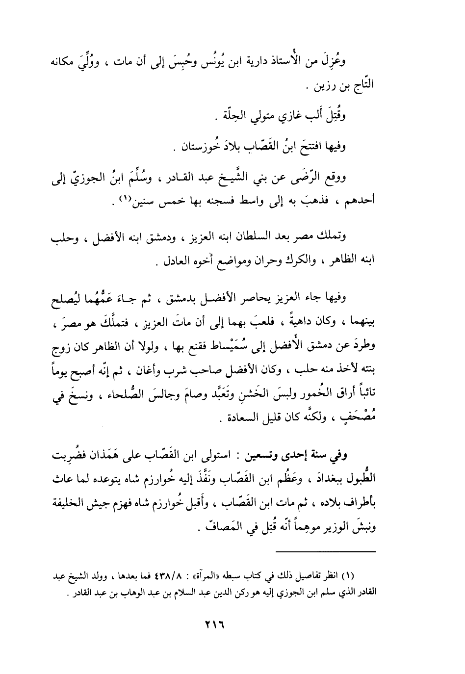 (1) انظر تفاصيل ذلك في كتاب سبطه " المرآة ": 8 / 438 فما بعدها، وولد الشيخ عبد القادر الذي سلم ابن الجوزي إليه هو ركن الدين عبد السلام بن عبد الوهاب بن عبد القادر.