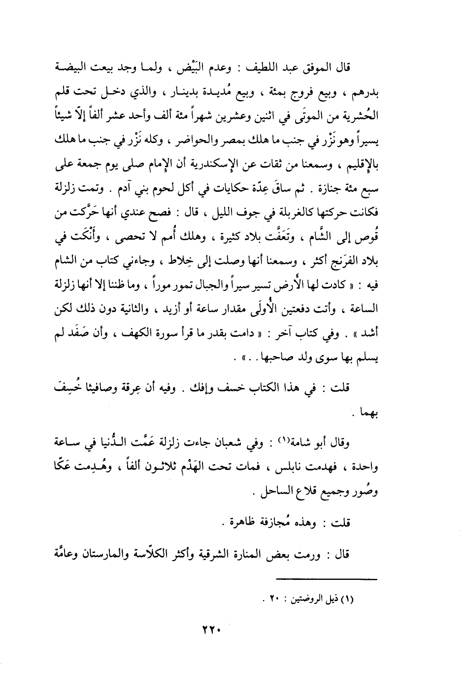 قَالَ المُوَفَّقُ عَبْدُ اللَّطِيْفِ: وَعُدِمَ البَيْضُ، وَلَمَّا وُجِدَ بِيْعَتِ البيضَةُ بِدِرْهَمٍ، وَبيعَ فَرُّوجٌ بِمائَةٍ، وَبيعَ مُدَيدَة بدِيْنَارٍ، وَالَّذِي دَخَلَ تَحْتَ قَلَمِ الحُشْرِيَّةِ مِنَ الموتَى فِي اثْنَيْنِ وَعِشْرِيْنَ شَهْراً مائَةُ أَلْفٍ وَأَحَدَ عشرَ أَلْفاً، إِلاَّ شَيْئاً يَسيراً، وَهُوَ نَزْرٌ فِي جَنْبِ مَا هَلَكَ بِمِصْرَ وَالحوَاضرِ، وَكلُّهُ نَزرٌ فِي جَنْبِ مَا هَلَكَ بِالإِقْلِيْمِ، وَسَمِعنَا مِنْ ثِقَاتٍ عَنِ الإِسْكَنْدَرِيَّةِ أَنَّ الإِمَامَ صَلَّى يَوْمَ جُمُعَةٍ عَلَى سَبْعِ مائَةِ جَنَازَةٍ، ثُمَّ سَاقَ عِدَّةَ حِكَايَاتٍ فِي أَكْلِ لُحُوْمِ بنِي آدَمَ، وَتَمَّتْ زَلْزَلَةٌ فَكَانَتْ حَرَكَتُهَا كَالغَرْبَلَةِ فِي جَوْفِ اللَّيْلِ، قَالَ: فَصحَّ عِنْدِي أَنَّهَا حَرَّكَتْ مِنْ قُوصٍ إِلَى الشَّامِ، وَتعفَّتْ بلاَدٌ كَثِيْرَةٌ، وَهَلَكَ أُمَمٌ لاَ تُحصَى، وَأَنْكَتْ فِي بلاَدِ الفِرَنْجِ أَكْثَرَ، وَسَمِعنَا أَنَّهَا وَصلَتْ إِلَى خِلاَطٍ، وَجَاءنِي كِتَابٌ مِنَ الشَّامِ فِيْهِ: كَادَتْ لَهَا الأَرْضُ تسيرُ سَيْراً، وَالجِبَالُ تَمورُ مَوْراً، وَمَا ظَنَنَّا إِلاَّ أَنَّهَا زَلْزَلَةُ السَّاعَةِ، وَأَتَتْ دُفْعَتَينِ: الأُوْلَى مِقْدَارَ سَاعَةٍ أَوْ أَزْيَدَ، وَالثَّانِيَةُ دُوْنَ ذَلِكَ، لَكِنْ أَشدُّ، وَفِي كِتَابٍ آخرَ: دَامَتْ بقدَرِ مَا قرَأَ سُوْرَةَ الكهفِ، وَأَنَّ صَفَدَ لَمْ يَسلَمْ بِهَا سِوَى وَلدِ صَاحِبِهَا ...