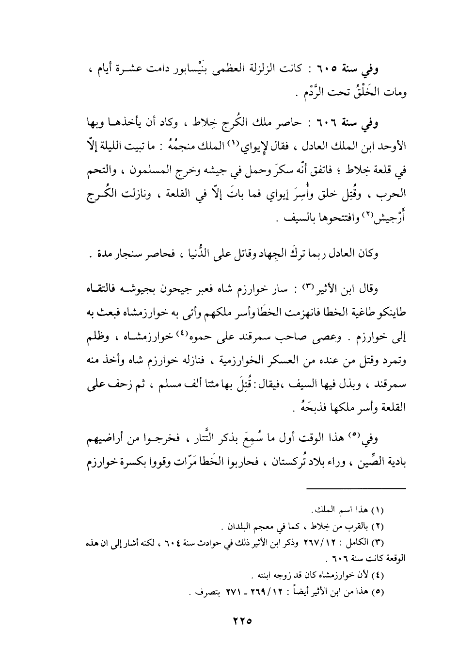 (3) الكامل: 12 / 267 وذكر ابن الأثير ذلك في حوادث سنة 604، لكنه أشار إلى ان هذه الوقعة كانت سنة 606.