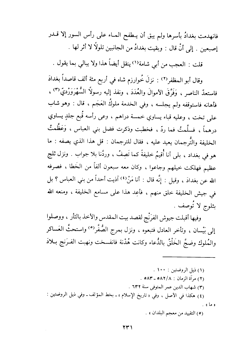 (4) هكذا في الأصل، وفي " تاريخ الإسلام " - بخط المؤلف - وفي ذيل الروضتين: " ما "