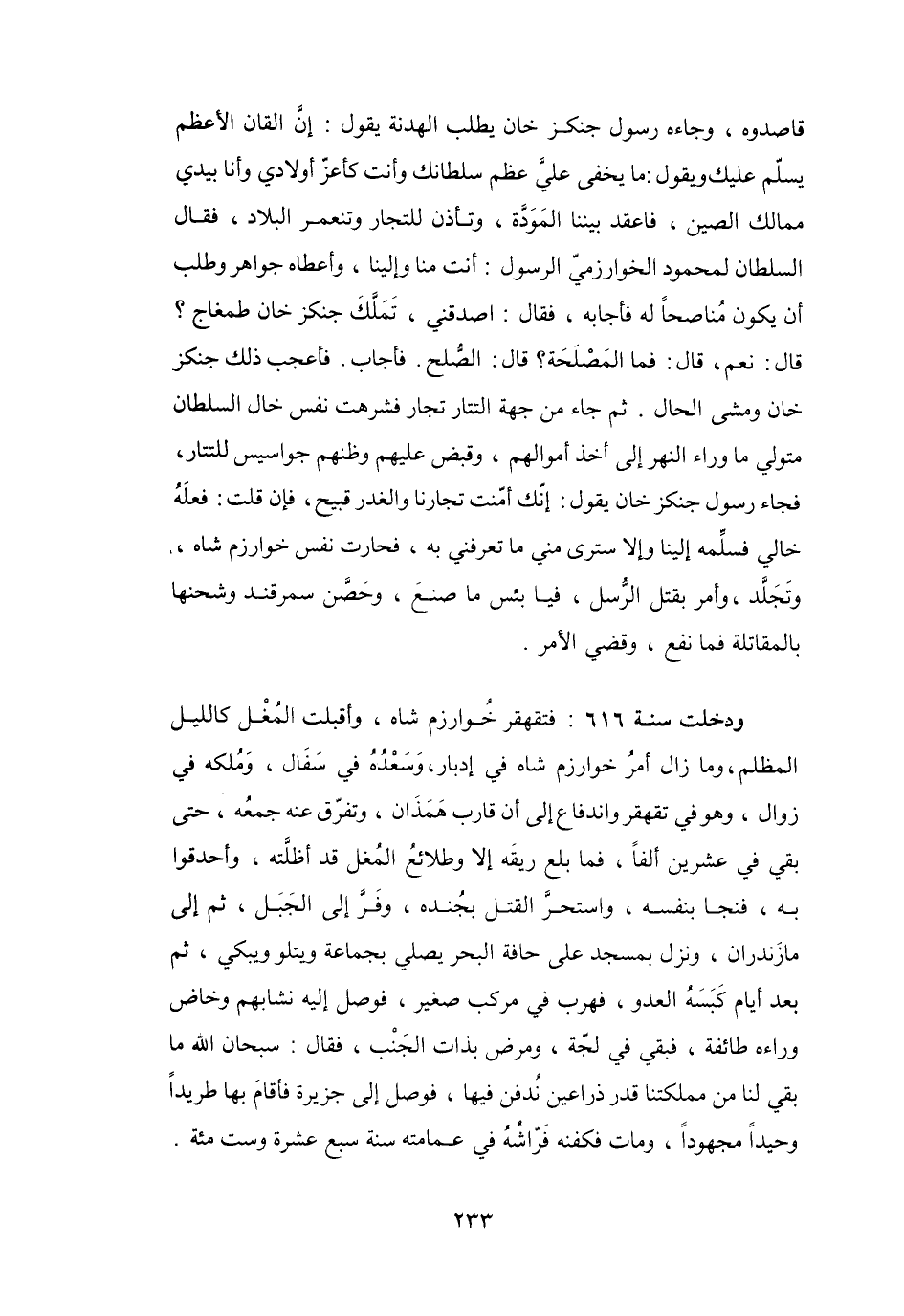 وَدَخَلتْ سَنَةُ 616: فَتقهقَرَ خُوَارِزْم شَاه، وَأَقْبَلتِ المُغْلُ كَاللَّيْلِ المُظْلِمِ، وَمَا زَالَ أَمرُ خُوَارِزْم شَاه فِي إِدبارٍ، وَسعدُهُ فِي سَفَالٍ، وَمُلْكُهُ فِي زوَالٍ، وَهُوَ فِي تَقهقُرٍ وَاندفَاعٍ، إِلَى أَنْ قَارَبَ هَمَذَانَ، وَتَفرَّقَ عَنْهُ جَمْعُهُ حَتَّى بَقِيَ فِي عِشْرِيْنَ أَلْفاً، فَمَا بَلَعَ رِيقَهُ إِلاَّ وَطلاَئِعُ المُغْلِ قَدْ أَظلَّتْهُ وَأَحَدقُوا بِهِ، فَنجَا بِنَفْسِهِ، وَاسْتَحَرَّ القتلُ بِجُندِهِ، وَفَرَّ إِلَى الجبلِ، ثُمَّ إِلَى مَازَندرَان، وَنَزَلَ بِمسجدٍ عَلَى حَافَّةِ البَحْرِ يُصَلِّي بِجَمَاعَةٍ، وَيَتلُو وَيَبْكِي، ثُمَّ بَعْدَ أَيَّامٍ كَبَسَهُ العَدُوُّ، فَهَرَبَ فِي مَرْكبٍ صَغِيْرٍ، فَوَصَلَ إِلَيْهِ نَشَّابُهُم، وَخَاضَ وَرَاءهُ طَائِفَةٌ، فَبقِيَ فِي لُجَّةٍ، وَمَرِضَ بِذَاتِ الجَنْبِ، فَقَالَ: سُبْحَانَ اللهِ! مَا بَقِيَ لَنَا مِنْ مَمْلَكَتِنَا قدرَ ذِرَاعَينِ نُدْفَنُ فِيْهَا.