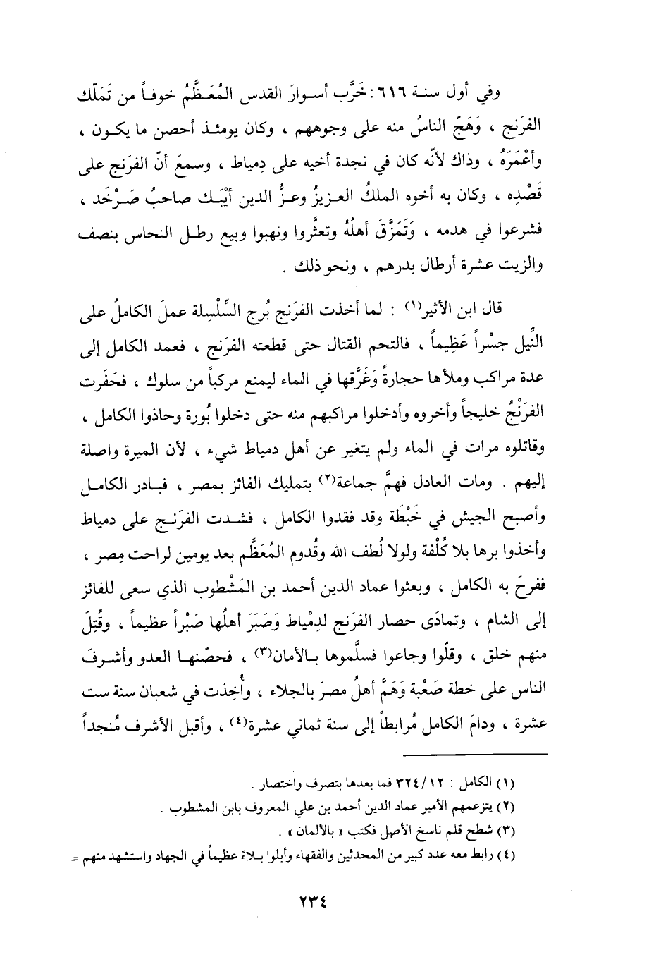 قَالَ ابْنُ الأَثِيْرِ (1) : لَمَّا أَخذَتِ الفِرَنْجُ برجُ السِّلْسِلَةِ، عَمِلَ الكَامِلُ عَلَى النِّيلِ جِسْراً عَظِيْماً، فَالتحَمَ القِتَالُ حَتَّى قطعَتْهُ الفِرَنْجُ، فَعمدَ الكَامِلُ إِلَى عِدَّةِ مَرَاكِبَ، وَملأَهَا حجَارَةً وَغَرَّقَهَا فِي المَاءِ ليمنَعَ مَرْكَباً مِنْ سُلُوْكٍ، فَحَفَرَتِ الفِرَنْجُ خَلِيْجاً وَأَخَّرُوهُ، وَأَدخلُوا مَرَاكِبَهُم مِنْهُ، حَتَّى دَخَلُوا بُورَةً، وَحَاذَوُا الكَامِلَ، وَقَاتَلُوْهُ مَرَّاتٍ فِي المَاءِ، وَلَمْ يَتغَيَّرْ عَنْ أَهْلِ دِمْيَاطَ شَيْءٌ، لأَنَّ المِيْرَةَ وَاصِلَةٌ إِلَيْهِم، وَمَاتَ العَادلُ، فَهَمَّ جَمَاعَةٌ (2) بِتَملِيكِ الفَائِزِ بِمِصْرَ، فَبَادرَ الكَامِلُ وَأَصْبَحَ الجَيْشُ فِي خَبْطَةٍ، وَقَدْ فَقَدُوا الكَامِلَ، فَشدَّتِ الفِرَنْجُ عَلَى دِمْيَاطَ، وَأَخَذُوا بَرَّهَا بِلاَ كُلْفَةٍ، وَلَوْلاَ لُطْفُ اللهِ وَقُدومُ المُعَظَّم بَعْدَ يَوْمَيْنِ لَرَاحتْ مِصْرُ، فَفَرحَ بِهِ الكَامِلُ، وَبعثَوا عِمَادَ الدِّيْنِ أَحْمَدَ بنَ المَشْطُوْبِ الَّذِي سَعَى لِلْفَائِزِ إِلَى الشَّامِ، وَتَمَادَى حِصَارُ الفِرَنْجِ لدِمْيَاطَ، وَصَبَرَ أَهْلُهَا صَبْراً عَظِيْماً، وَقُتِلَ مِنْهُم خلقٌ، وَقَلُّوا وَجَاعُوا، فَسلَّمُوهَا بِالأَمَانِ (3) ، فَحَصَّنَهَا العَدُوُّ، وَأَشرفَ النَّاسُ عَلَى خِطَّةٍ صَعْبَةٍ، وَهَمَّ أَهْلُ مِصْرَ بِالجلاَءِ، وَأُخِذَتْ فِي شَعْبَانَ سَنَةَ سِتَّ عَشْرَةَ، وَدَامَ الكَامِلُ مُرَابِطاً إِلَى سَنَةِ ثَمَانِي عَشْرَةَ (4) ، وَأَقْبَلَ الأَشْرَفُ مُنْجِداً