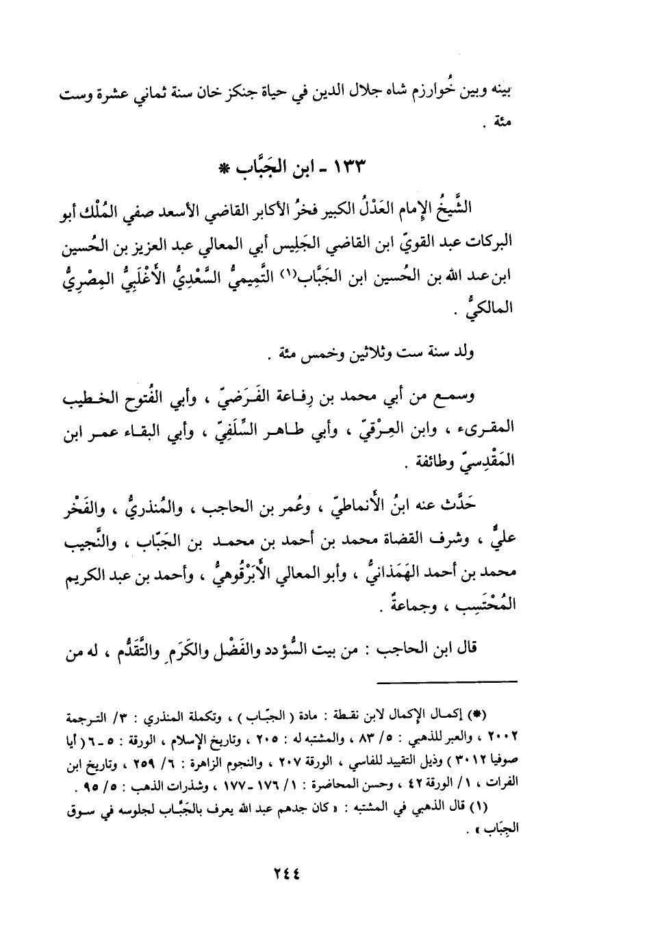 (*) إكمال الإكمال لابن نقطة: مادة (الجباب) وتكملة المنذري: 3 / الترجمة 2002، والعبر للذهبي: 5 / 83، والمشتبه له: 205، وتاريخ الإسلام، الورقة: 5 - 6 (أيا صوفيا 3012) وذيل التقييد للفاسي، الورقة 207، والنجوم الزاهرة: 6 / 259، وتاريخ ابن الفرات، 1 / الورقة 42، وحسن المحاضرة: 1 / 176 - 177، وشذرات الذهب: 5 / 95.