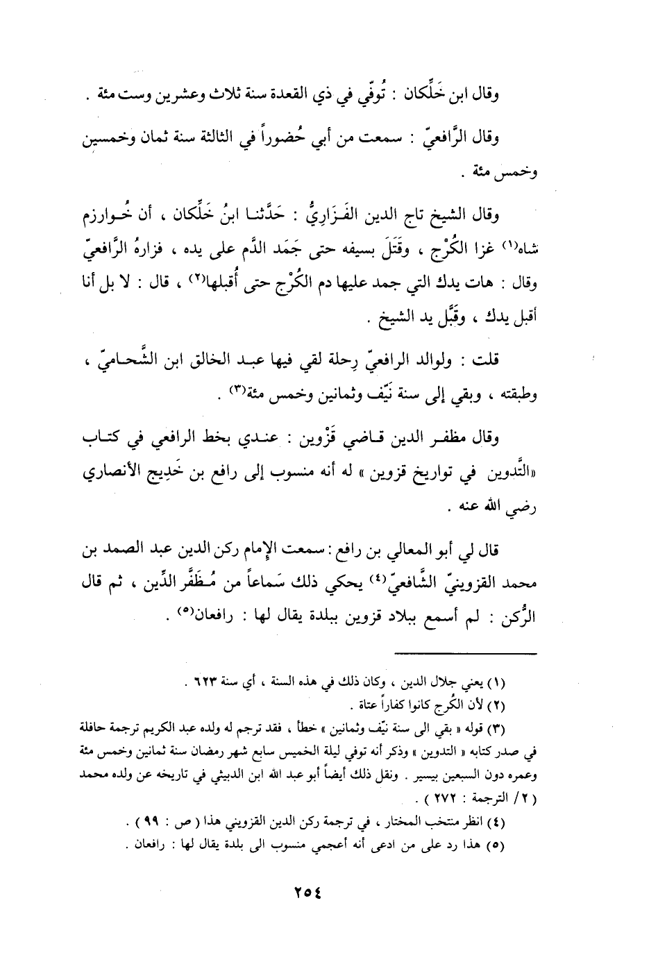 قَالَ لِي أَبُو المَعَالِي بنُ رَافِعٍ: سَمِعْتُ الإِمَامَ رُكْنَ الدِّيْنِ عَبْدَ الصَّمَدِ بنَ مُحَمَّدٍ القَزْوِيْنِيَّ الشَّافِعِيَّ (4) يَحكِي ذَلِكَ سَمَاعاً مِنْ مُظَفَّرِ الدِّيْنِ، ثُمَّ قَالَ الرُّكْنُ: لَمْ أَسْمَعْ بِبلاَدِ قَزْوِيْنَ بِبلدَةٍ يُقَالُ لَهَا: رَافِعَانِ (5) .