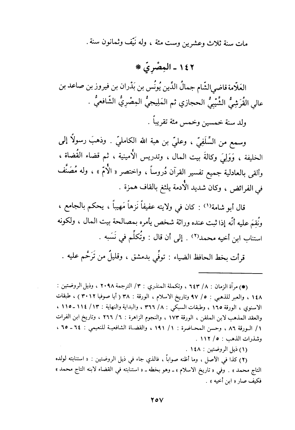 (*) مرآة الزمان: 8 / 643، وتكملة المنذري: 3 / الترجمة 2098، وذيل الروضتين: 148، والعبر للذهبي: 5 / 97 وتاريخ الإسلام، الورقة: 38 (أيا صوفيا 3012) ، طبقات الاسنوي، الورقة 165، وطبقات السبكي: 8 / 366، والبداية والنهاية: 13 / 114 - 115، والعقد المذهب لابن الملقن، الورقة 173، والنجوم الزاهرة: 6 / 266، وتاريخ ابن الفرات 1 / الورقة 86، وحسن المحاضرة: 1 / 191، والقضاة الشافعية للنعيمي: 64 - 65، وشذرات الذهب: 5 / 112.