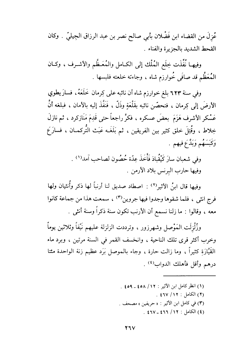 وَزُلِزْلَت المَوْصِل وَشهرزور، وَترددت الزَّلْزَلَة عَلَيْهِم نَيِّفاً وَثَلاَثِيْنَ يَوْماً، وَخرب أَكْثَر قرَى تِلْكَ النَّاحيَة، وَانخسف القَمَر فِي السَّنَةِ مرَّتين، وَبرد مَاء القَيَّارَةِ كَثِيْراً، وَمَا زَالت حَارة، وَجَاءَ بِالمَوْصِلِ بَرَد عَظِيْم، زنَة الوَاحِدَة مائَتَا دِرْهَم وَأَقلّ، فَأَهْلك الدَّوَابّ (4) .